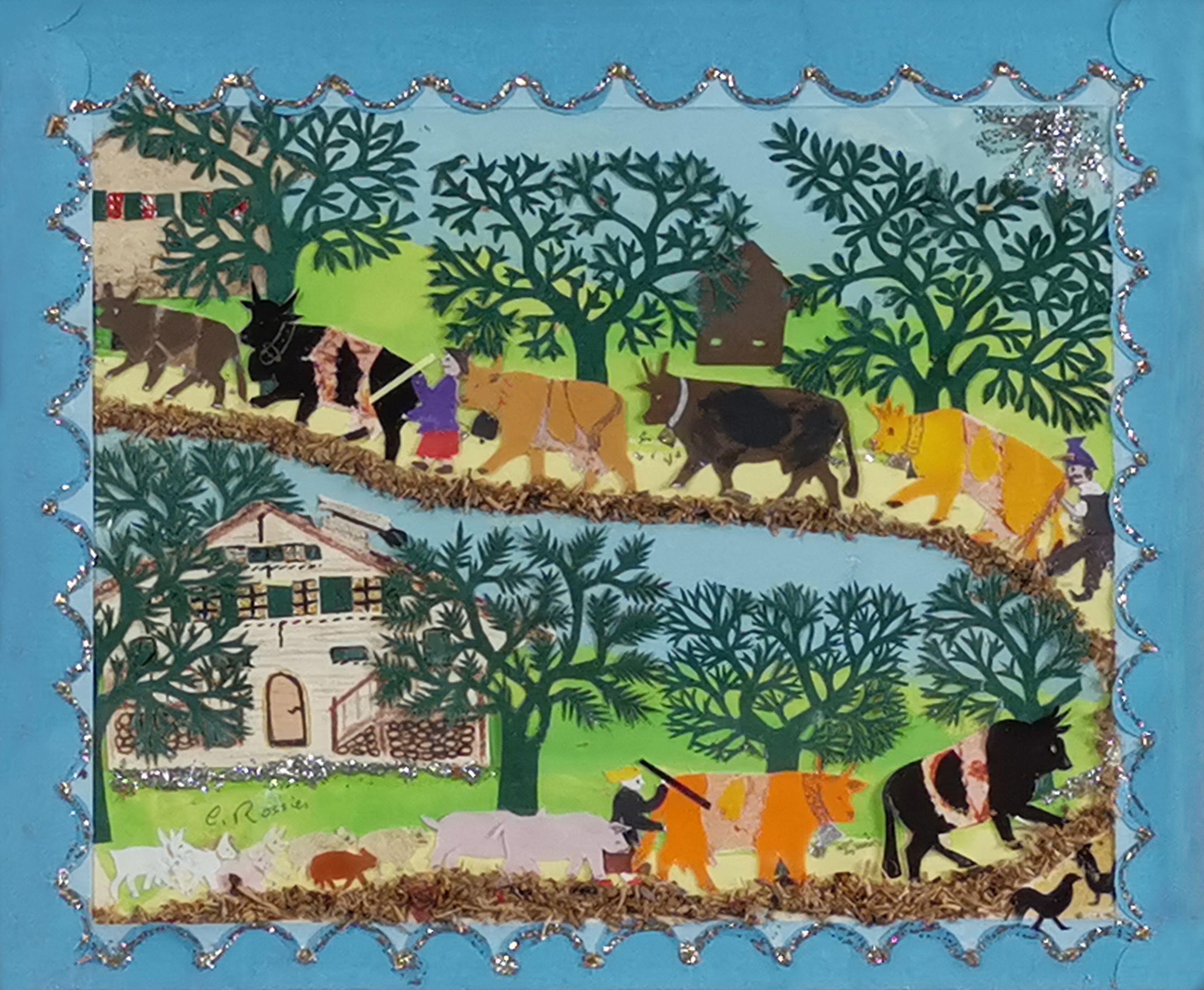 Scène de montée à l'alpage, découpage en couleurs, signé, 19,5x23 cm.