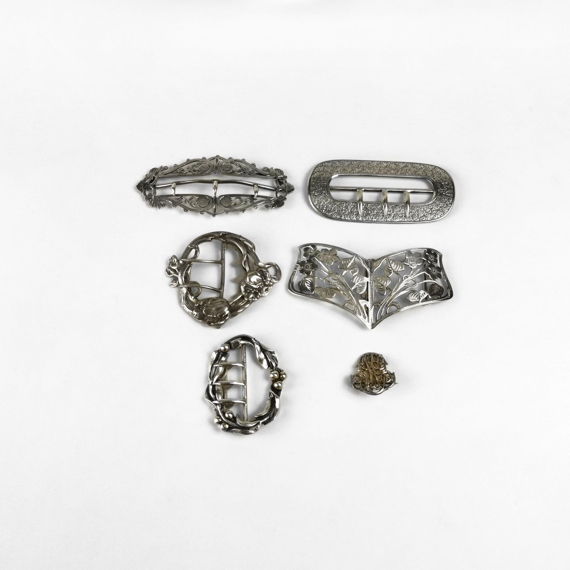 4604. Collection de 5 boucles de ceinture Art nouveau et 1 broche monogrammée