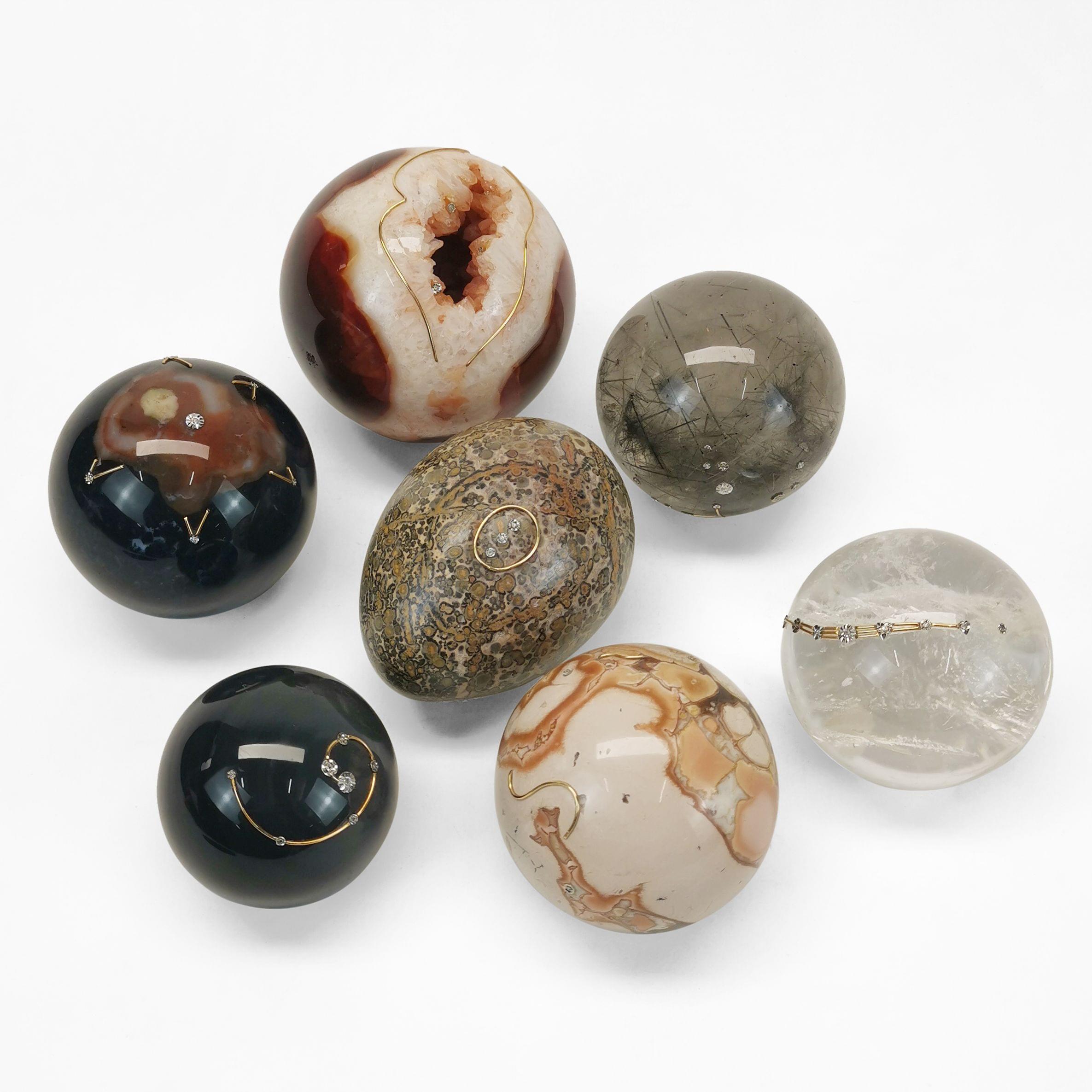 Pierres dures polies, certaines serties de diamants et d'or, D de 4 à 8 cm