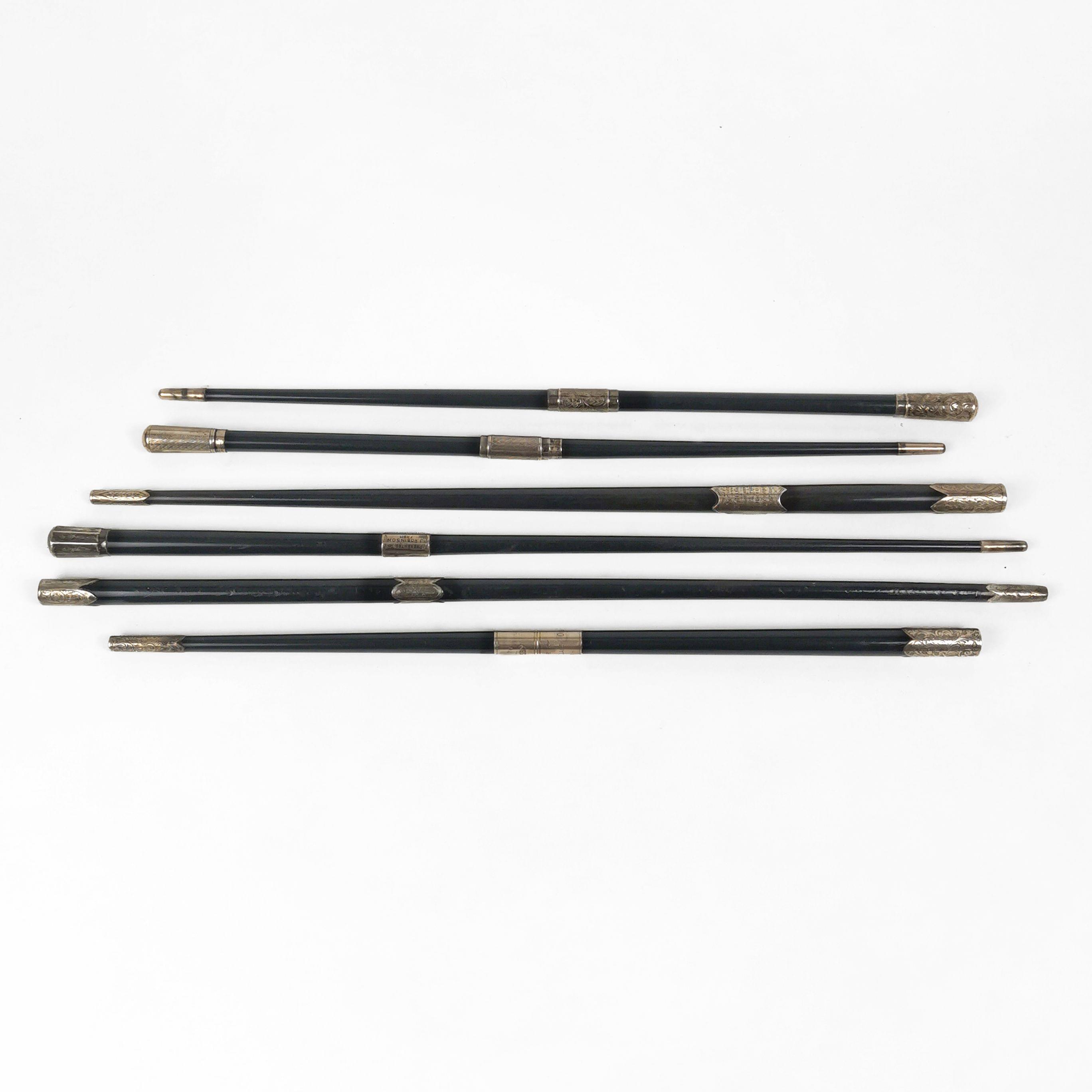 Pommeaux à décor gravé de rinceaux et autres, argent, métal et bois noirci, L de 44 à 52 cm