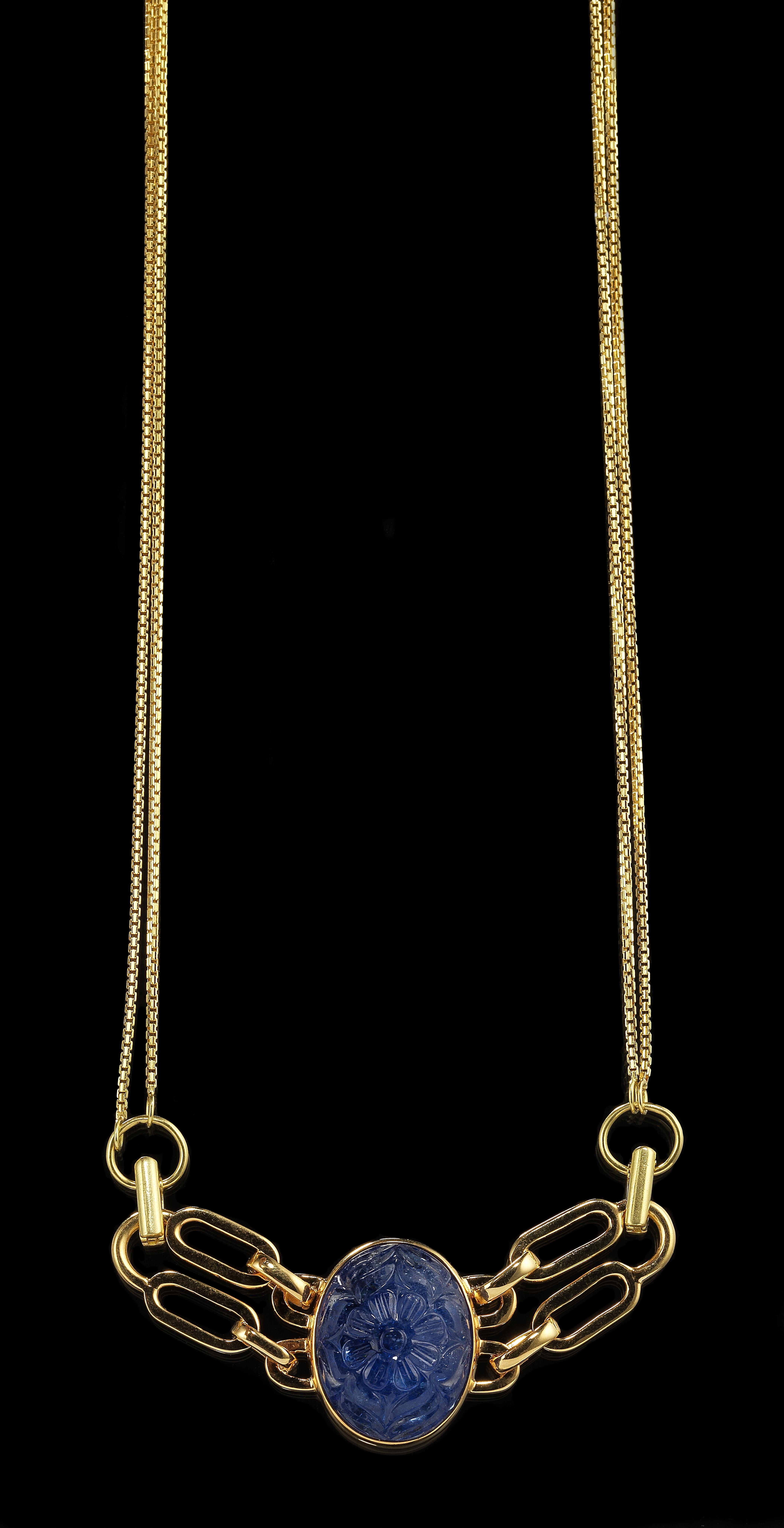 Retenant un pendentif serti d'une tanzanite taille cabochon ovale sculptée à motif floral (45 ct), or 750, L 48 cm, 36 g, accompagné d'un certificat GCI. Pour les lots précédés d'un *, la TVA de 7,7% est due sur l'entier du prix d'adjudication.
