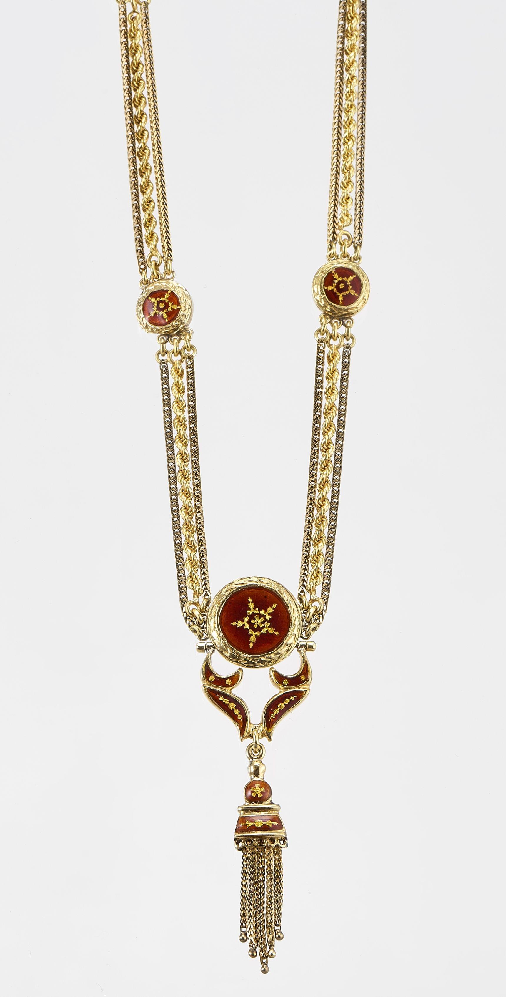 69. Chaîne à maille vénitienne retenant un pendentif Art déco ajouré...