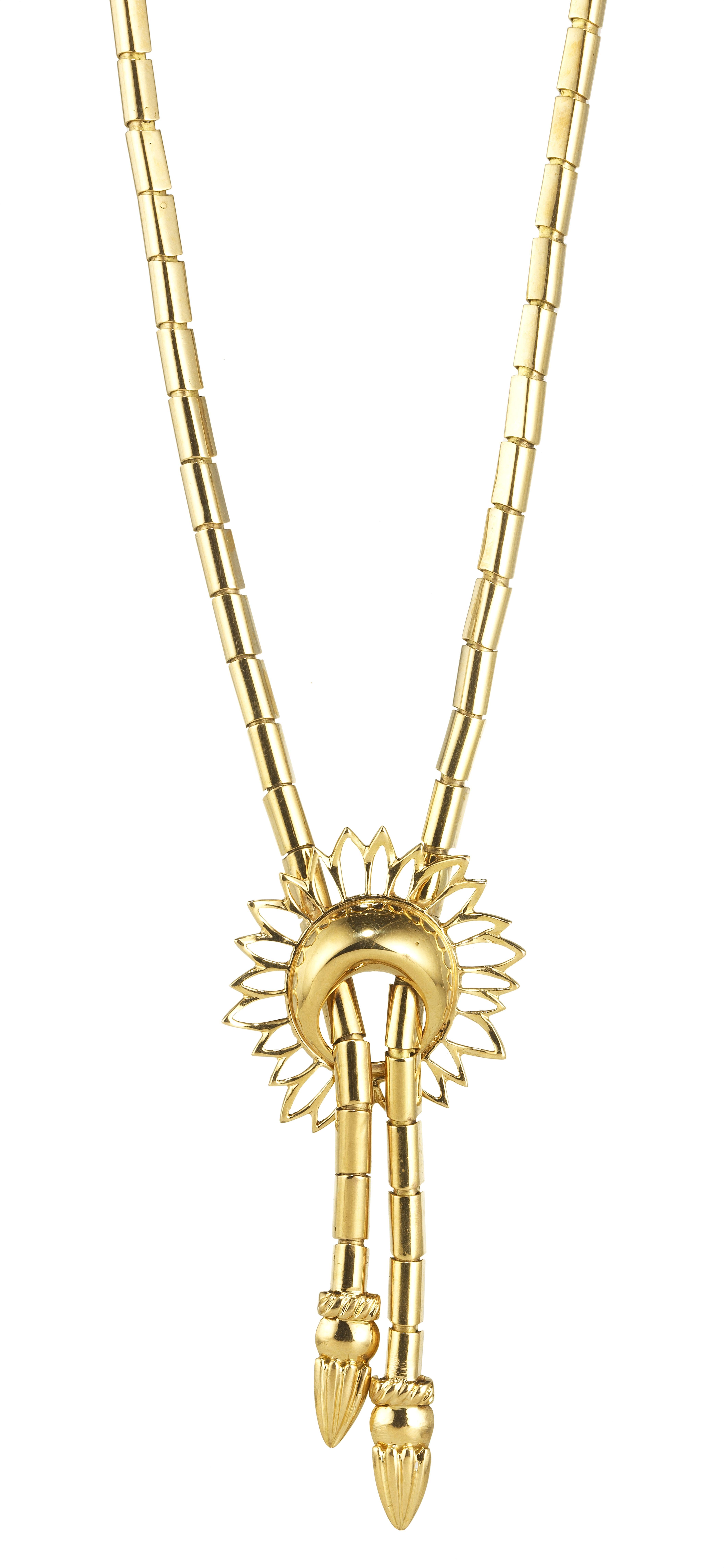 3511. Collier à maille fantaisie retenant un motif solaire stylisé enserrant deux pampilles