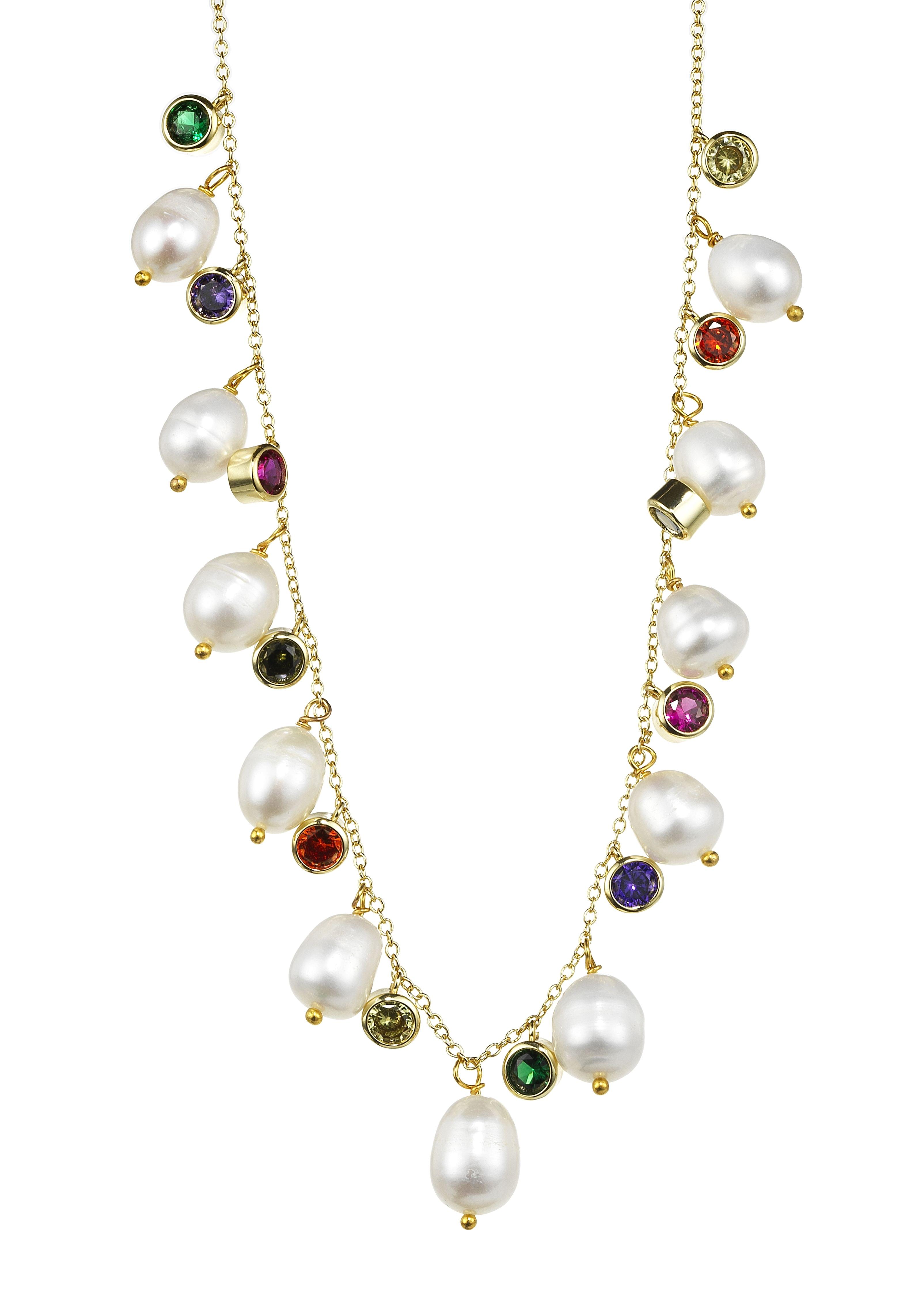3069. *Collier à maille forçat retenant des perles baroques blanches (D env. 9 mm) alternées de pierres d'imitation