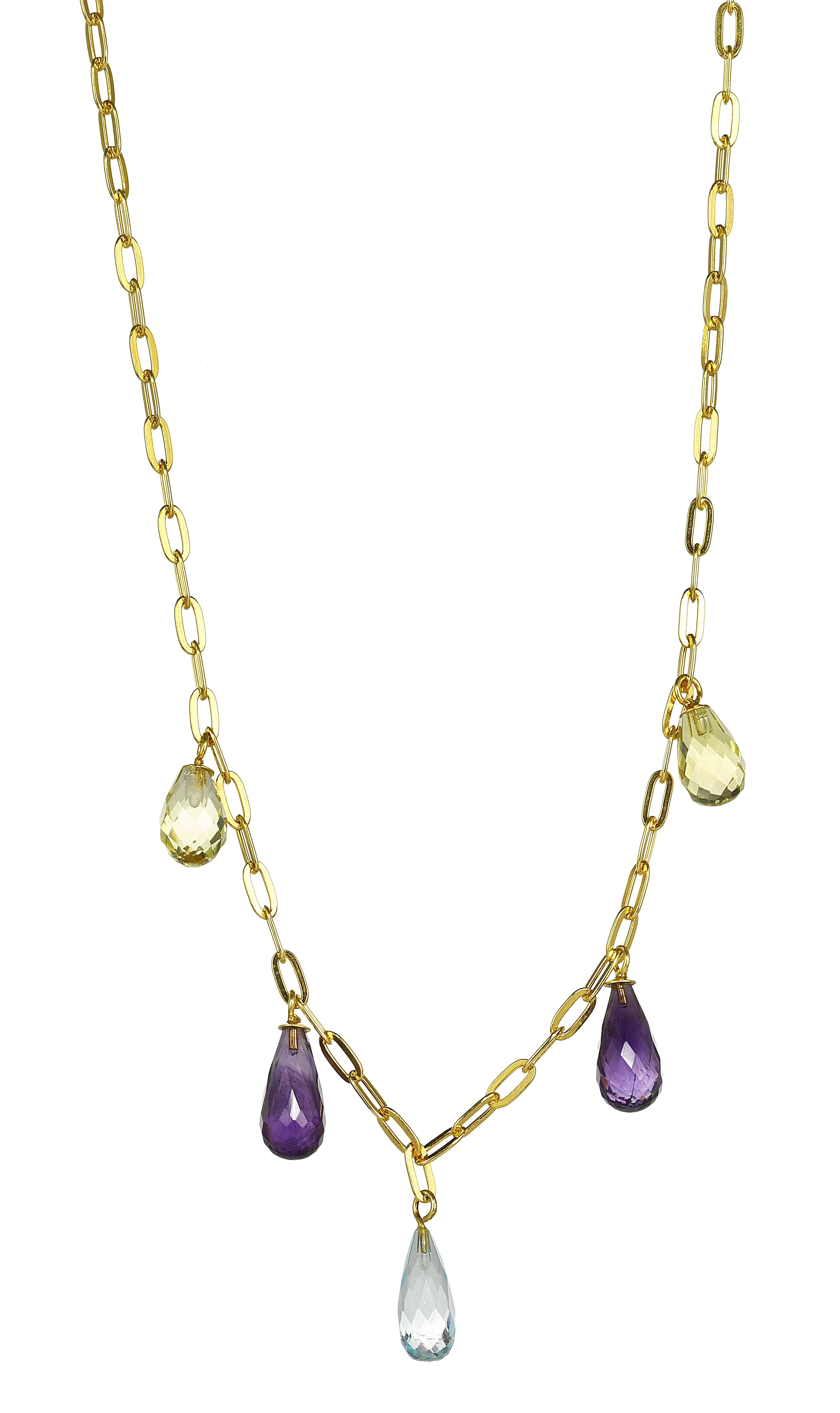 Retenant des gouttes de topaze bleue, améthystes et prasiolites en briolette, vermeil 925, L 43,5 cm. Pour les lots précédés d'un *, la TVA de 7,7% est due sur l'entier du prix d'adjudication.
