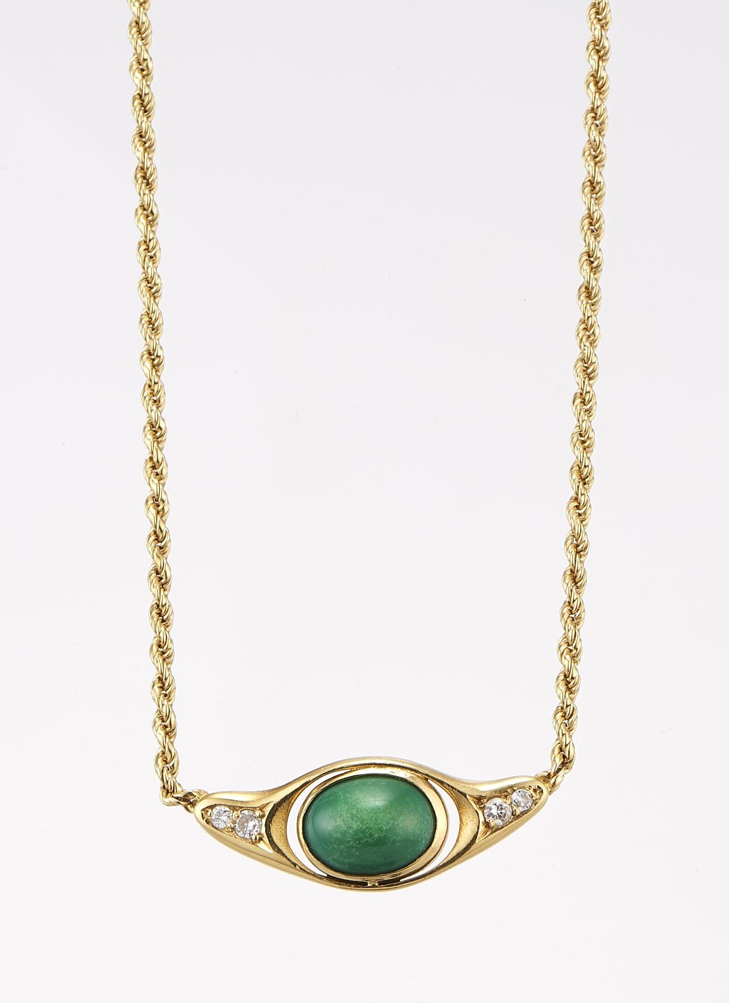 3457. Collier à maille torsadée centré d'un motif serti d'une turquoise taille cabochon ovale rehaussée de diamants
