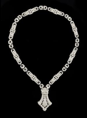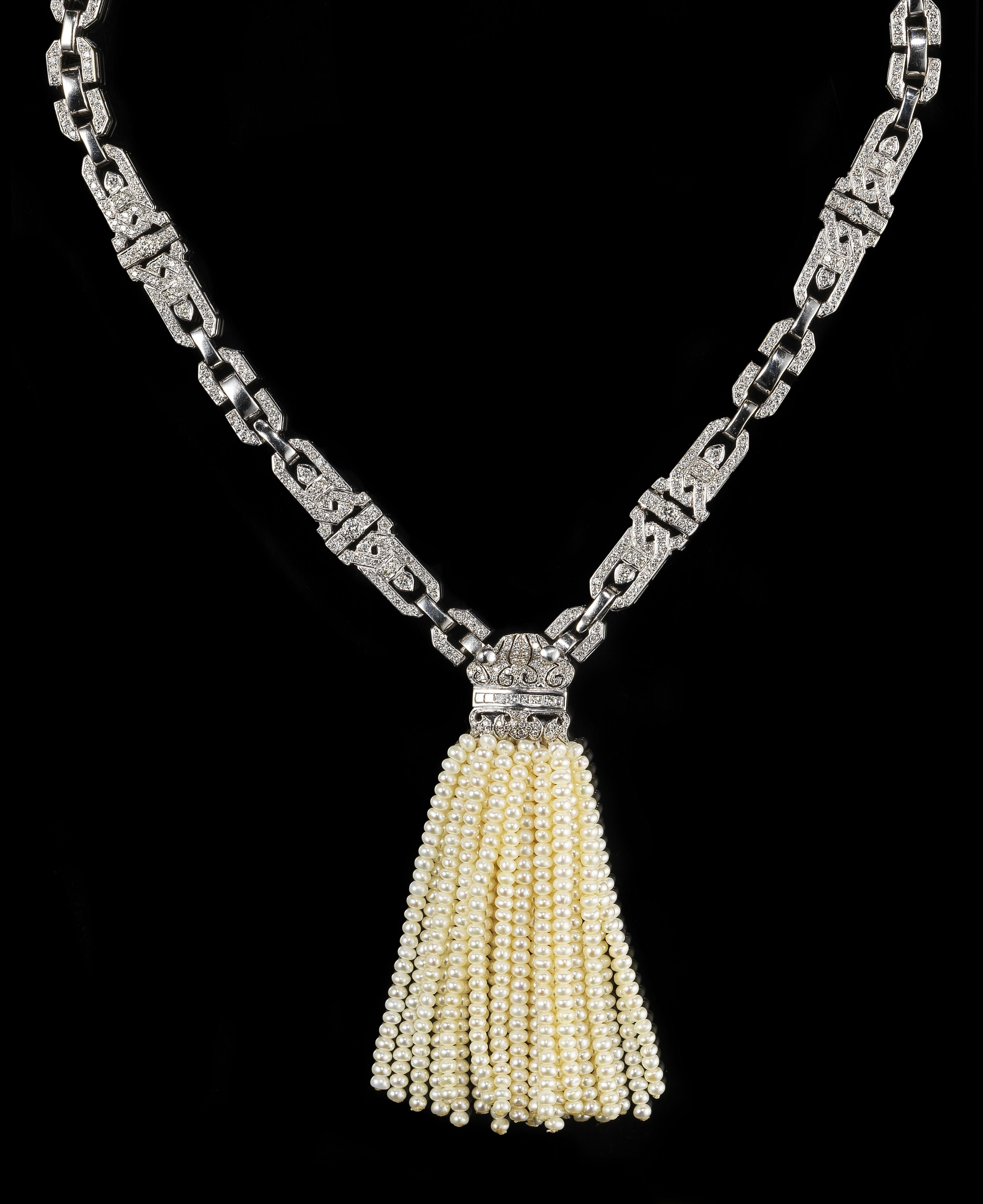 Pavé de diamants et terminé par trois motifs interchangeables dont l'un pavé de diamants pouvant se porter en broche ou en pendentif et les deux autres formant des pompons de perles rehaussées de diamants, or gris 750, L 43 cm, poids brut 127 g