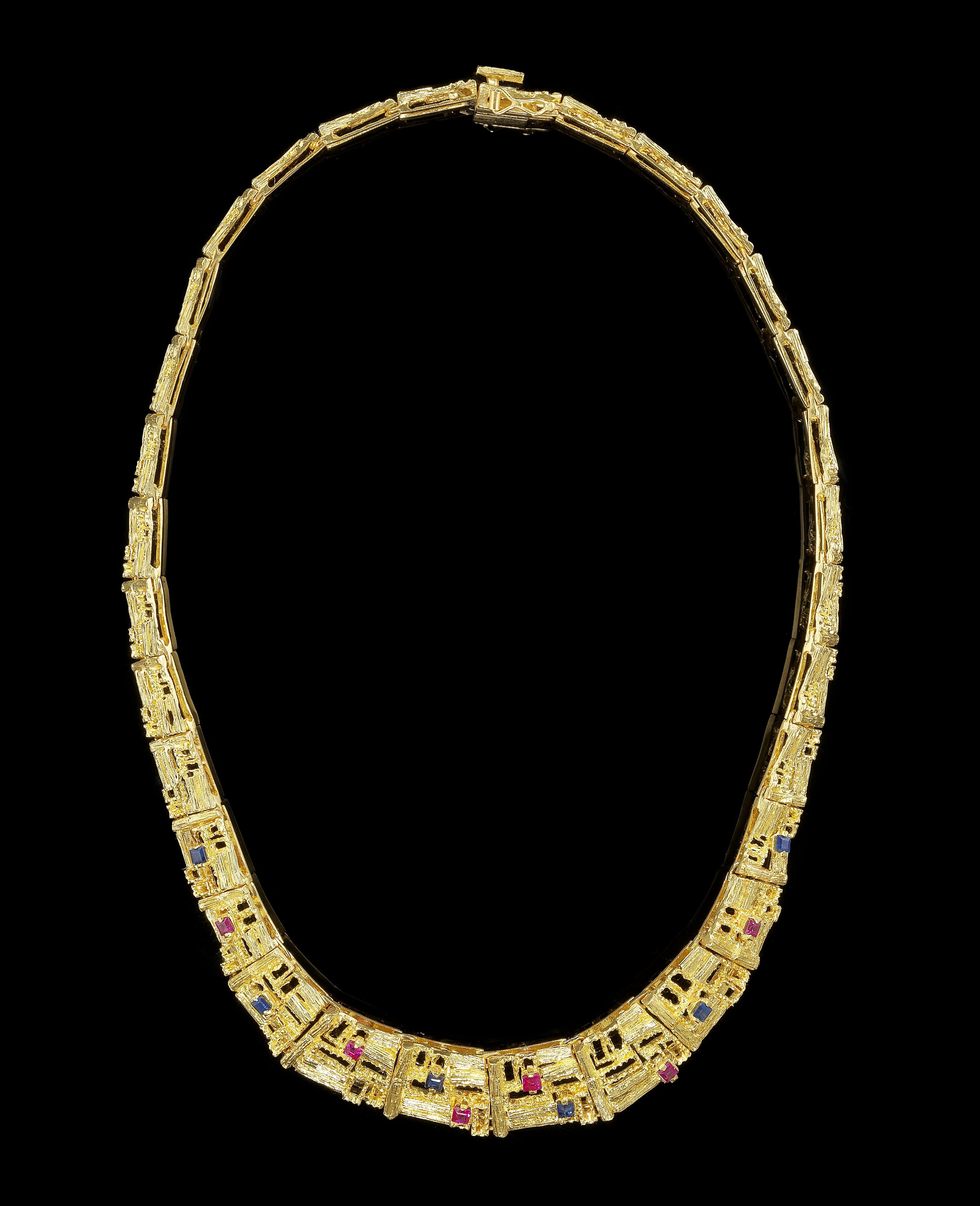 Epaulée de deux diamants taille trapèze, rehaussés de lignes de...