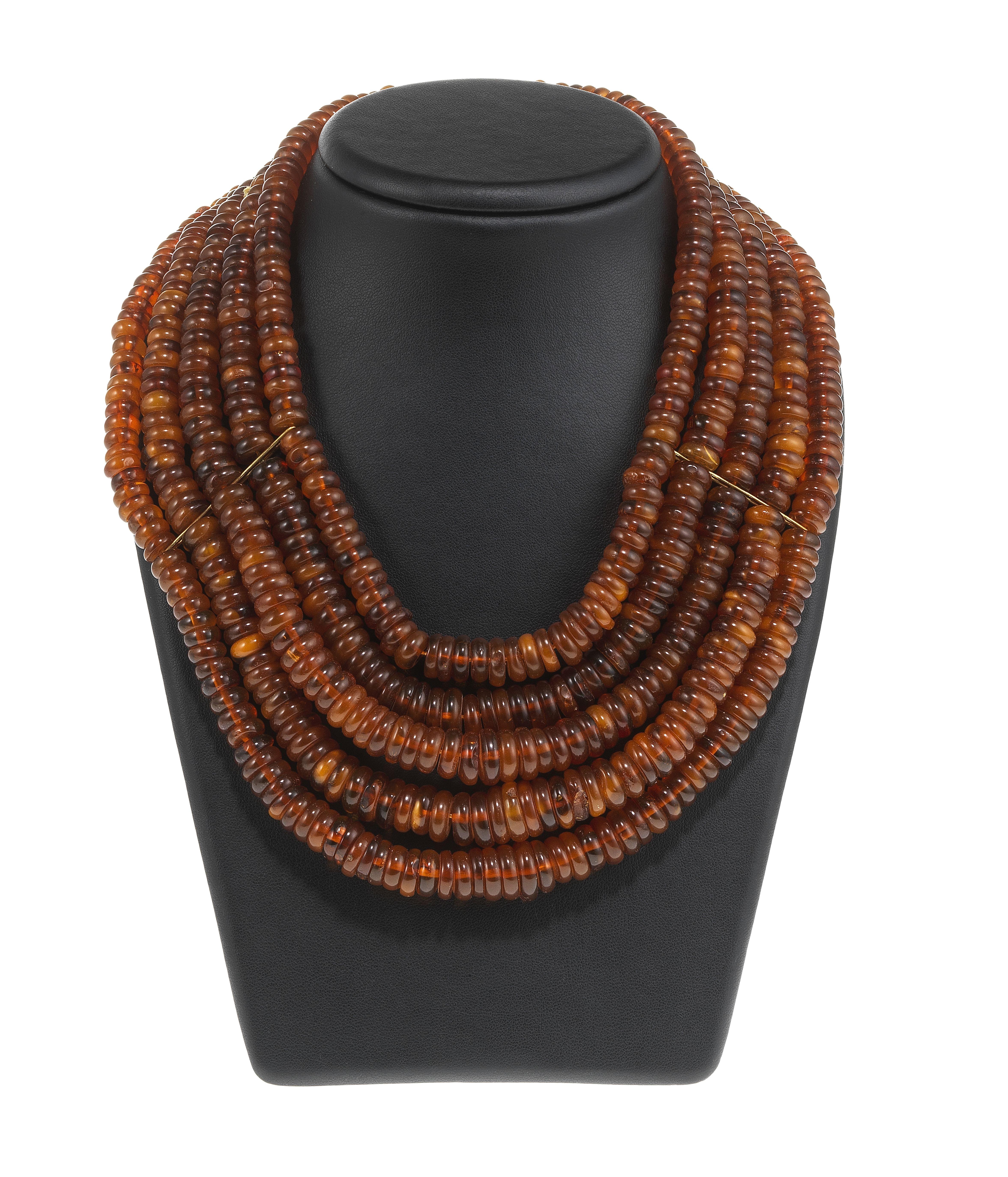 3222. Collier composé de cinq rangs de perles d'ambres ponctués de deux barrettes