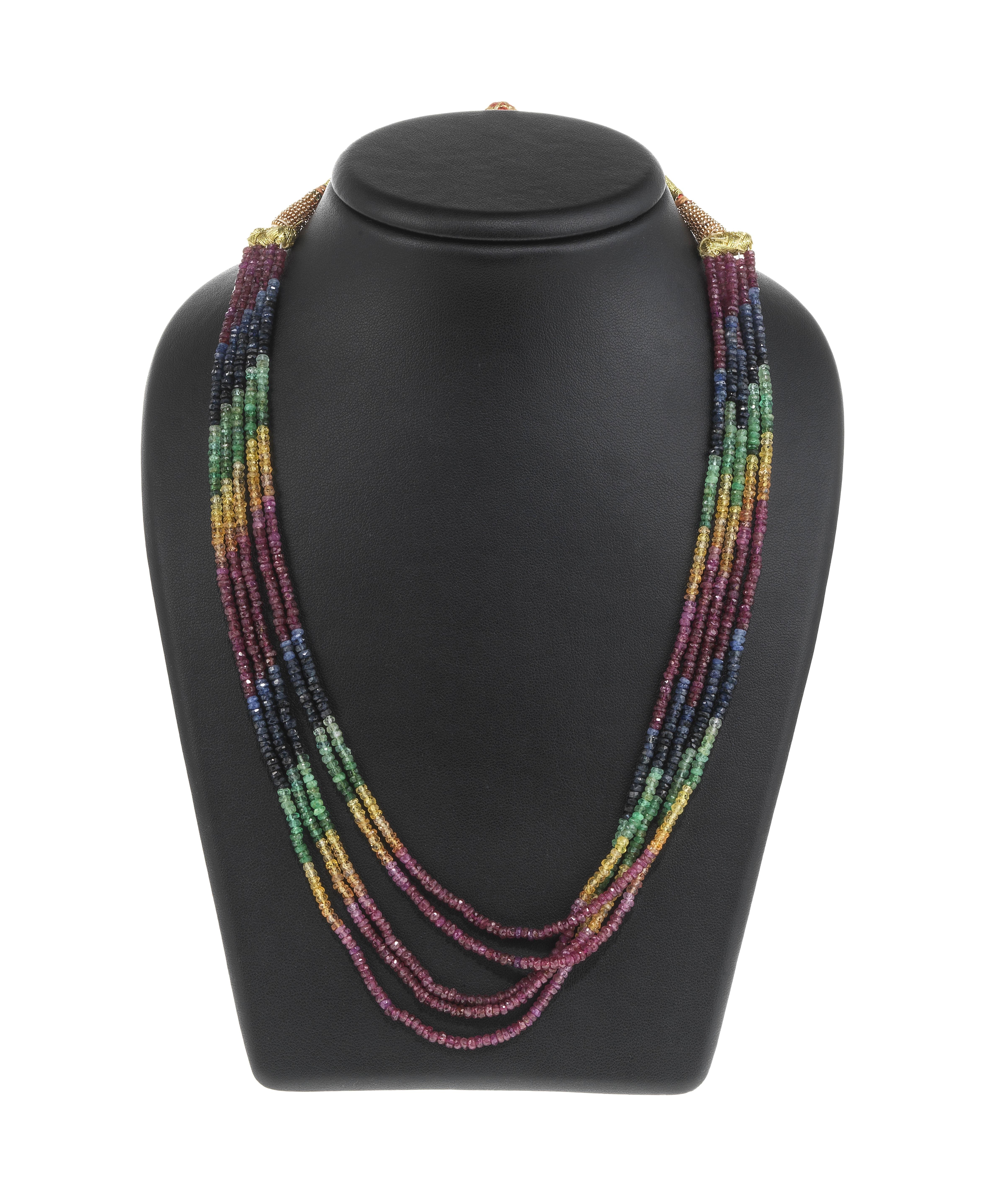 3125. *Collier composé de cinq rangs de perles facetées de rubis, saphirs, émeraudes et saphirs jaunes formant un dégradé