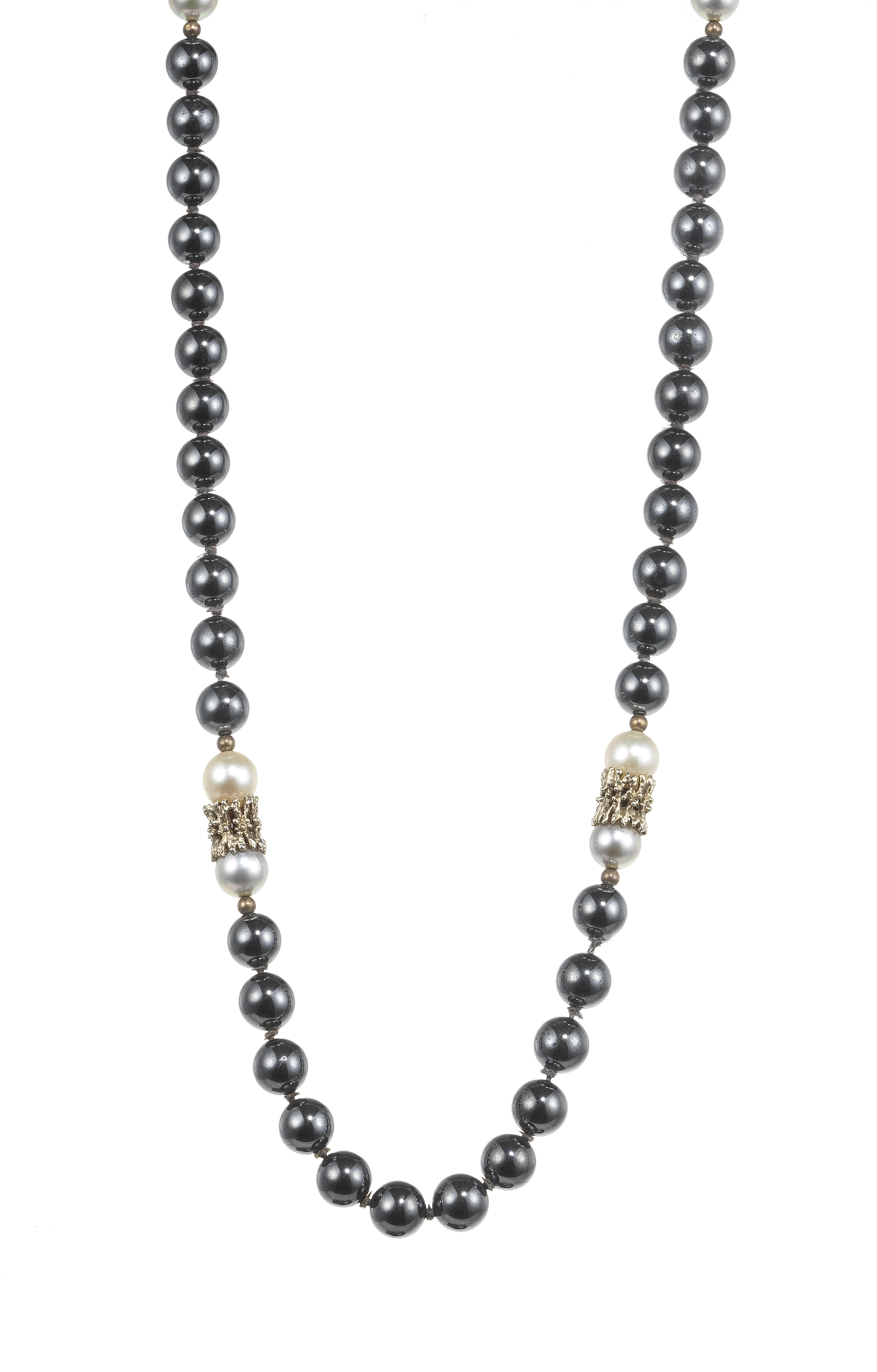 3044. Collier composé de perles d'hématites ponctuées de motifs stylisés et de perles