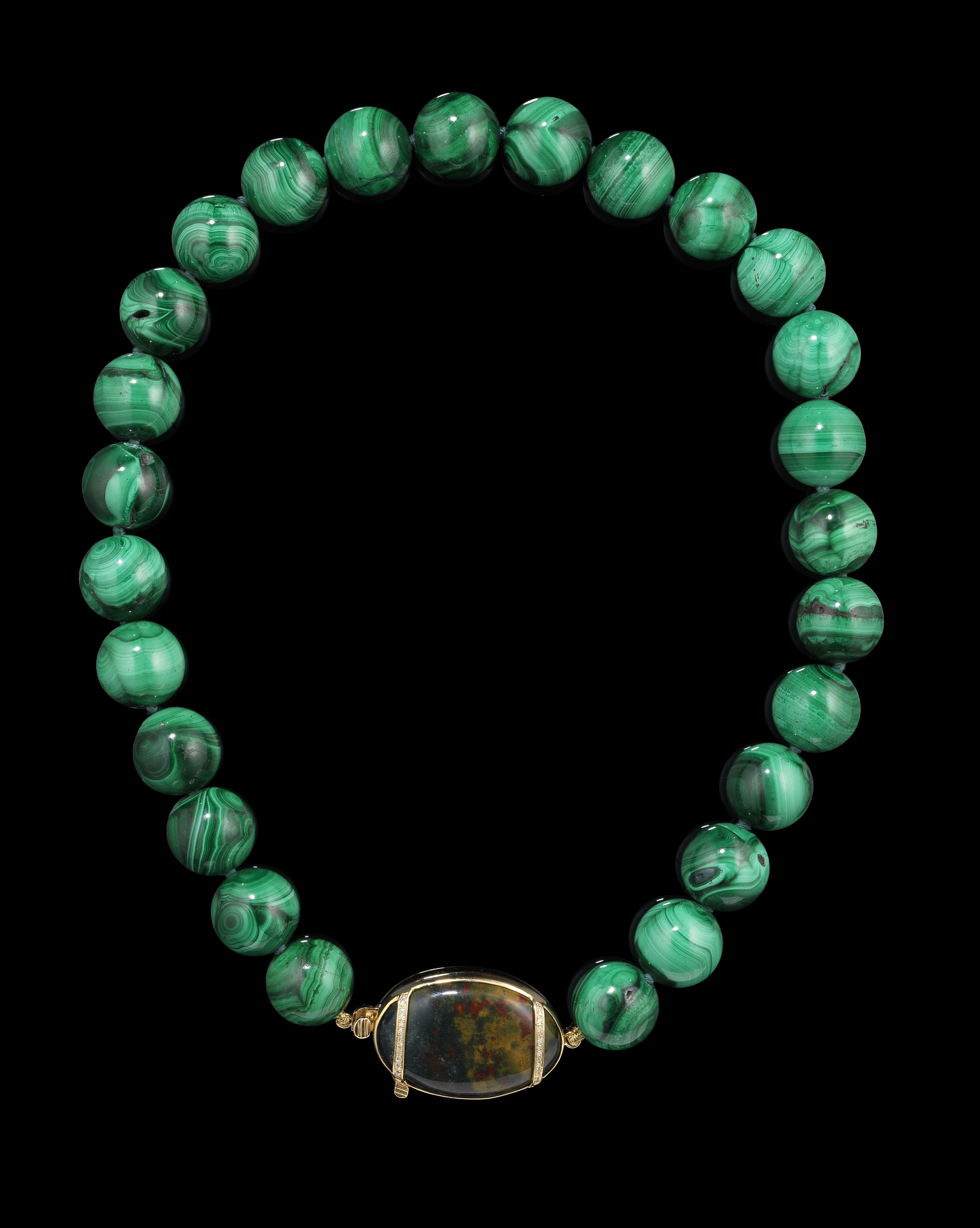 3371. *Collier composé de perles de malachite (D env. 15 mm) terminé par un important fermoir serti d'un jaspe rehaussé de deux lignes de diamants