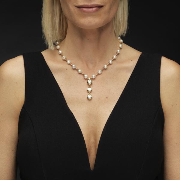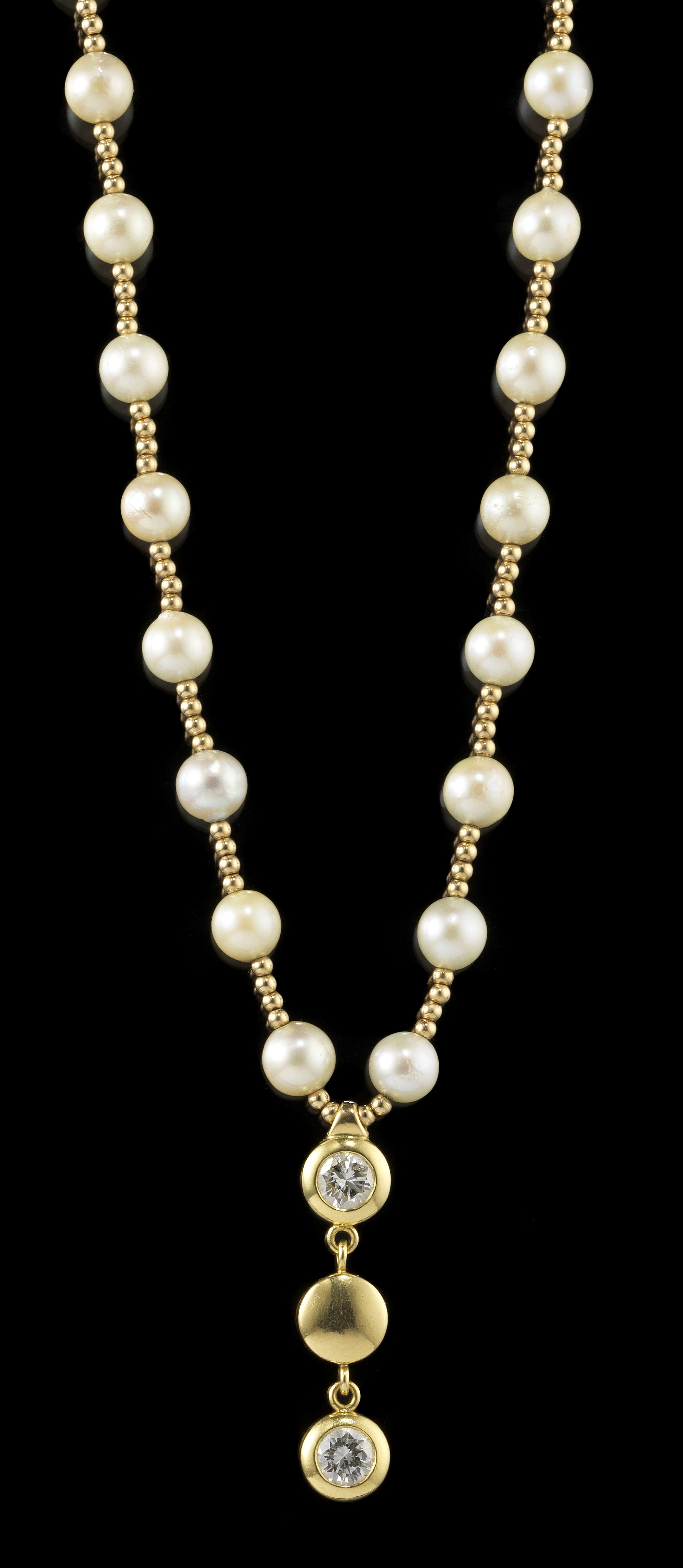 144. Collier composé de perles et de perlettes d'or en alternance retenant deux diamants en pendentif (env. 1,1 et 1 ct)