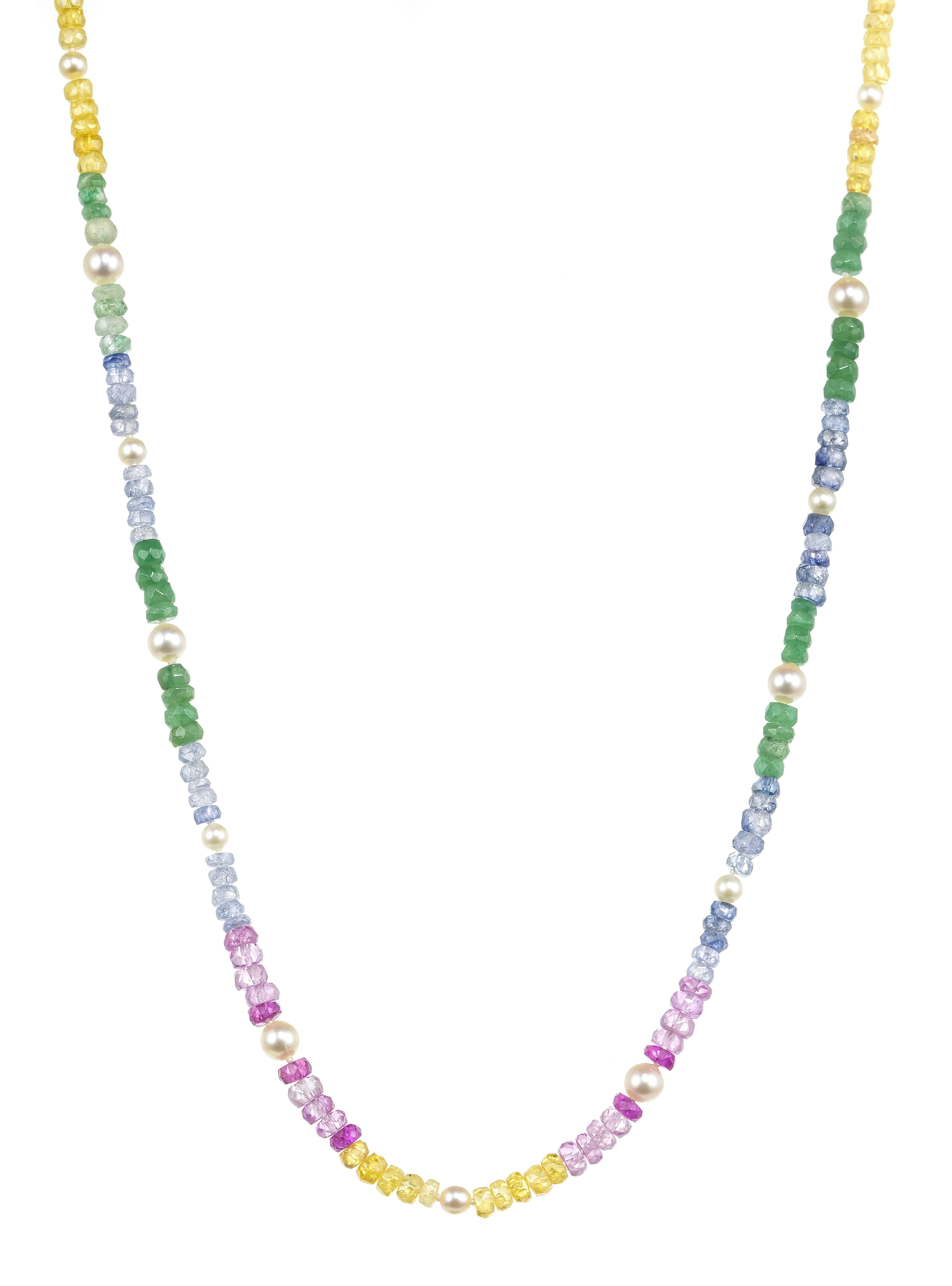 3355. Collier composé de perles facettées de saphirs, saphirs jaunes, saphirs roses, rubis et émeraudes en dégradé ponctuées de perles