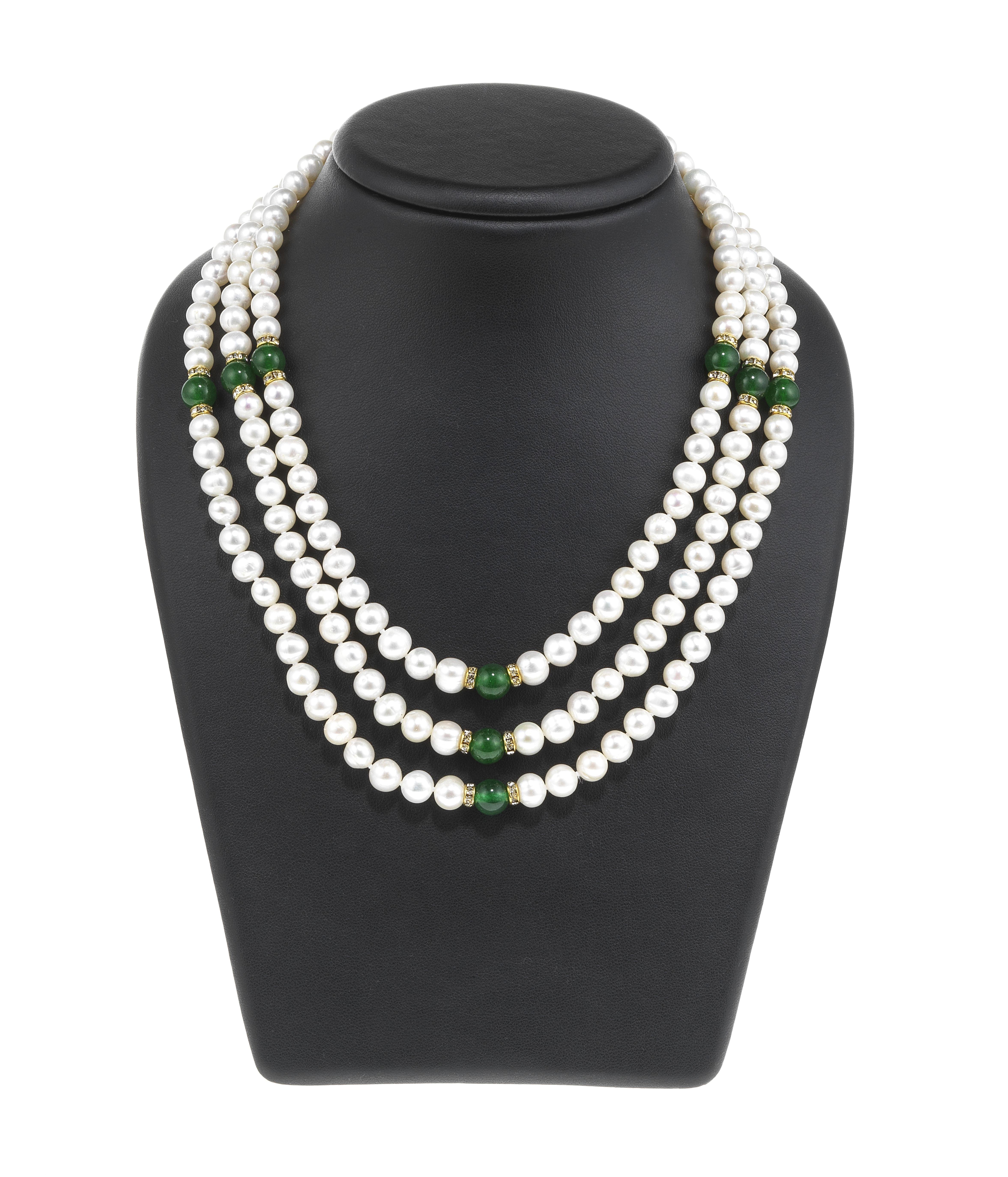 3053. Collier composé de trois rangs de perles ponctuées de perles d'agate verte et de pierres d'imitation
