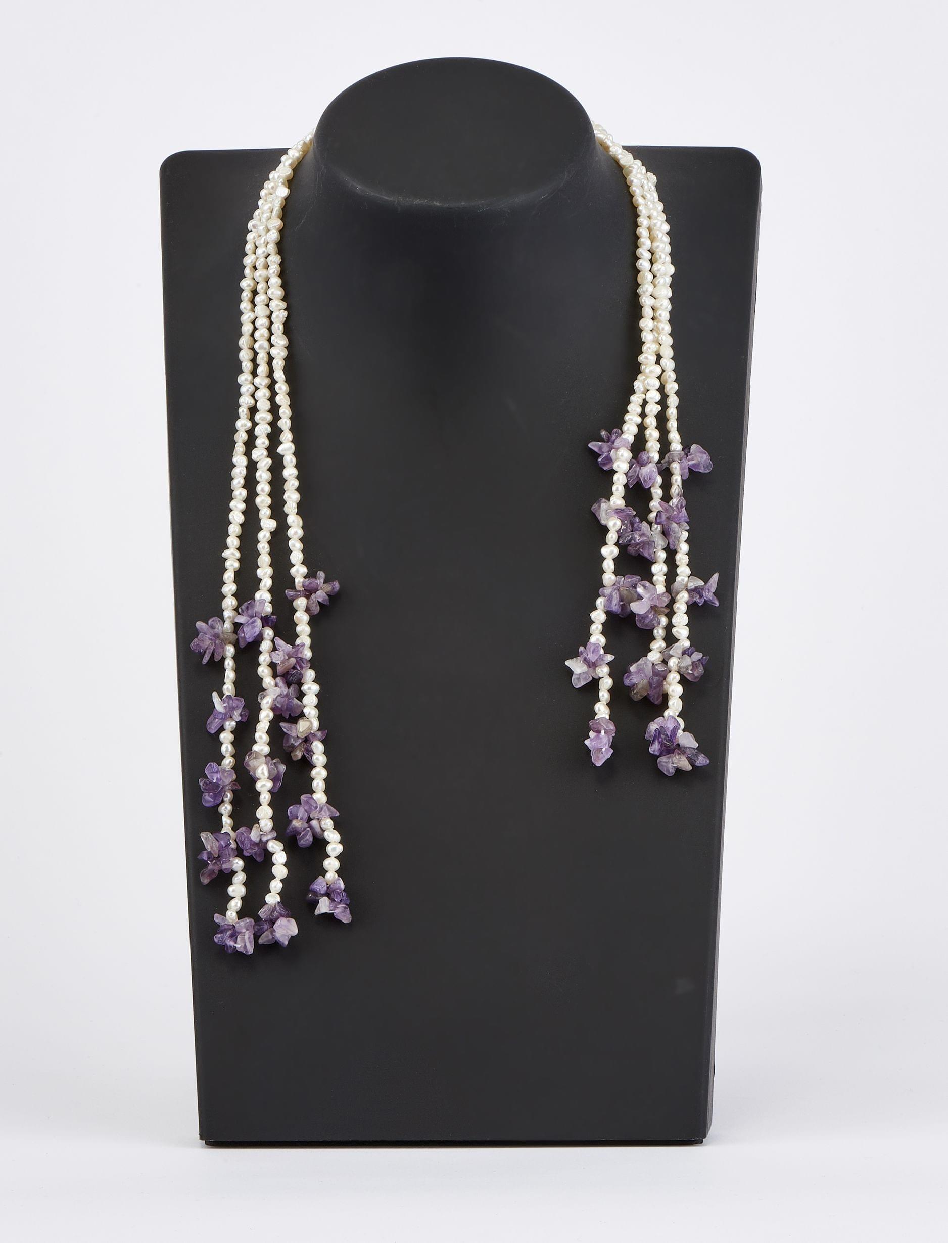 3157. Collier cravate multi-rangs de perles d'eau douce ponctué d'améthystes