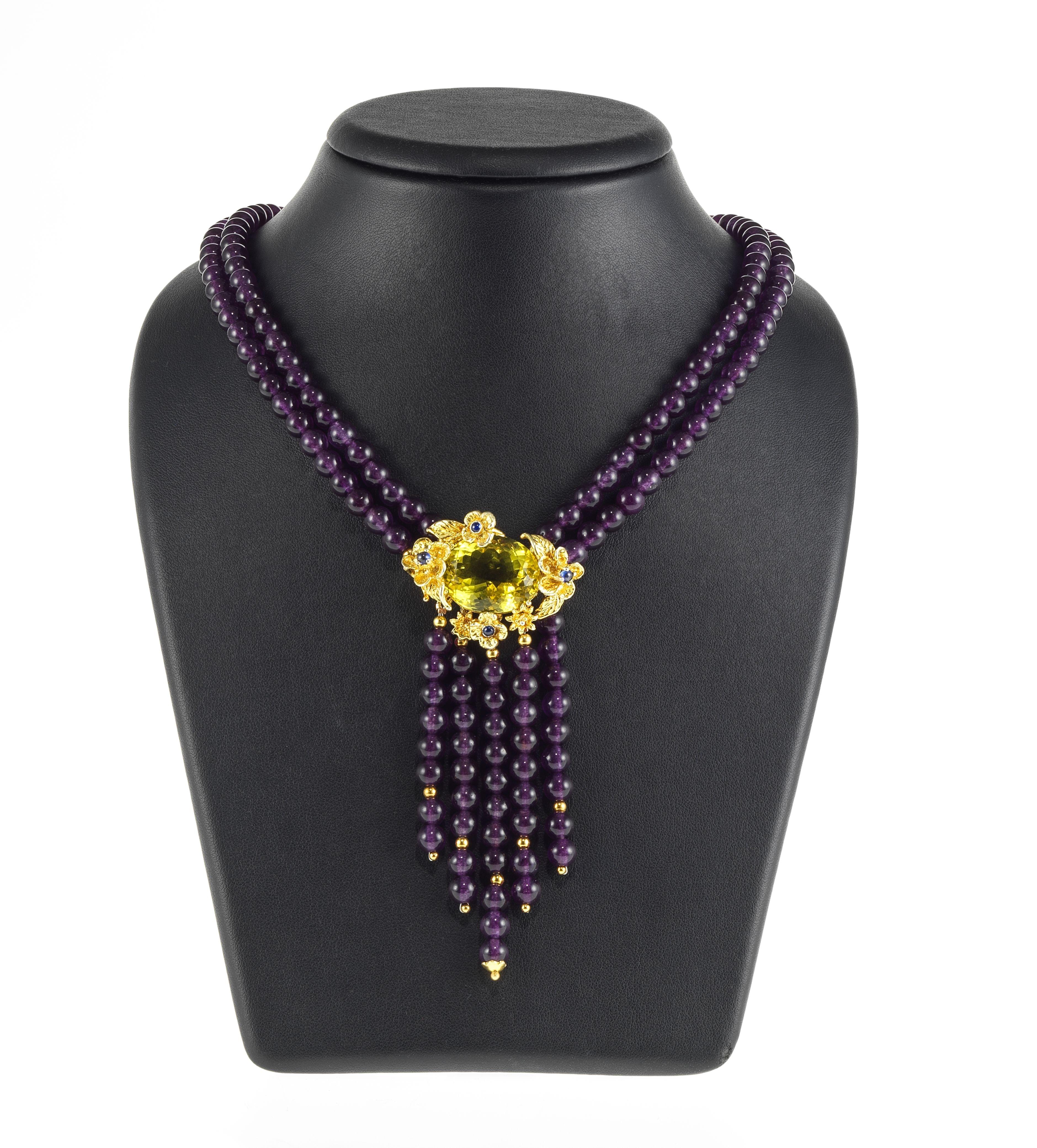 3154. *Collier de deux rangs de perles d'améthystes retenant un motif floral serti d'un quartz jaune taille ovale (env. 20 ct) rehaussé de saphirs