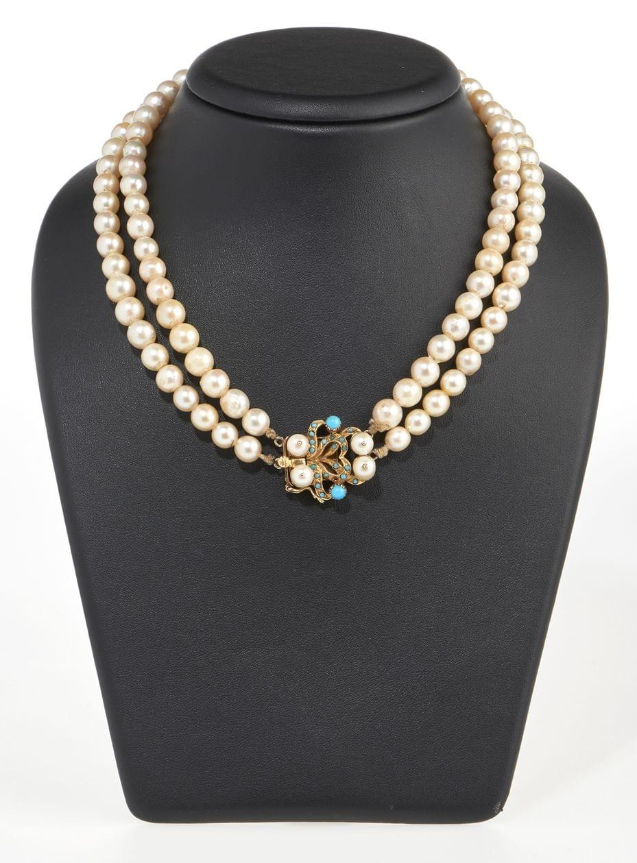 3192. Collier de deux rangs de perles terminé par un fermoir serti de perles et de turquoises