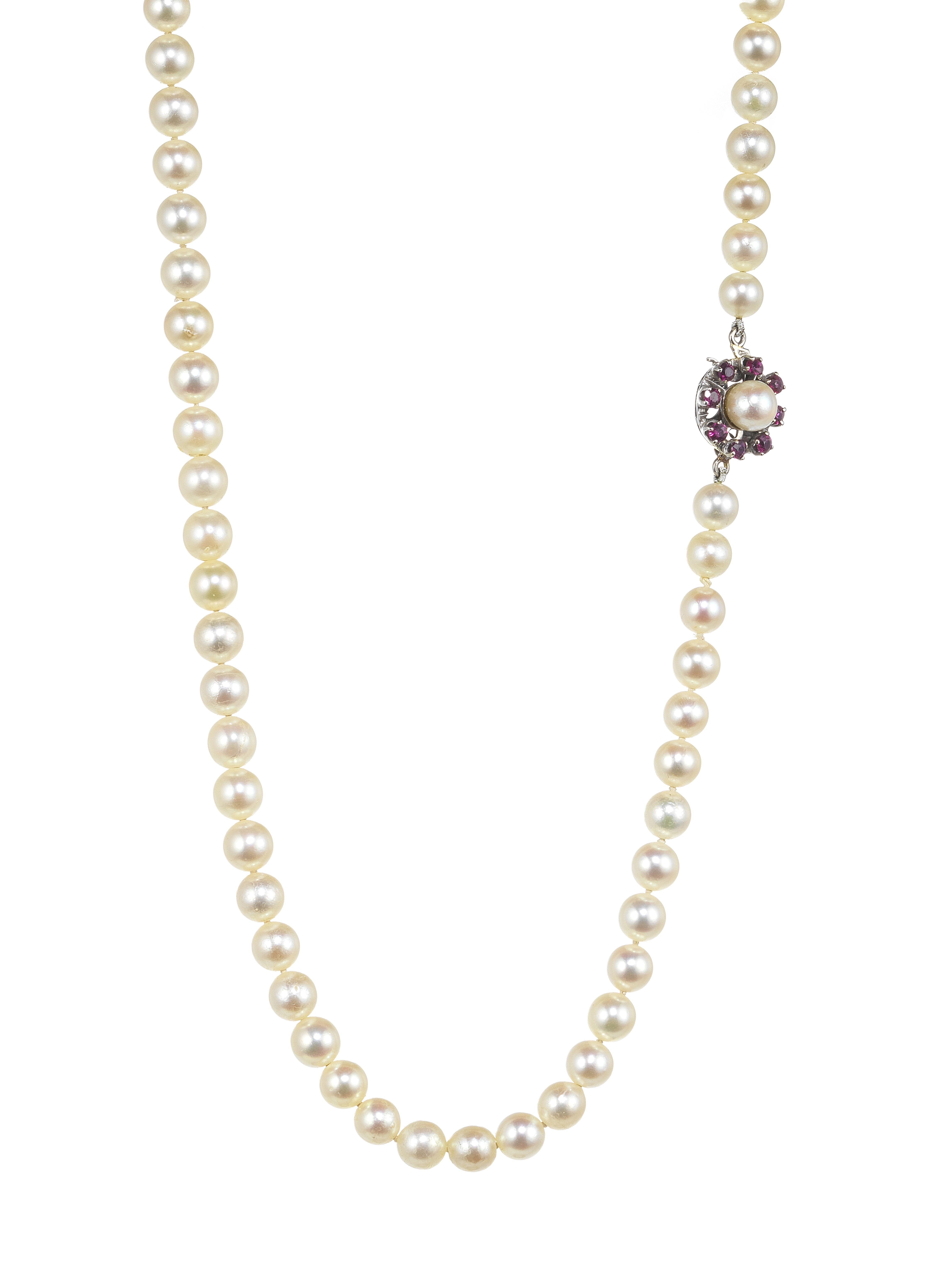 3227. Collier de perle en légère chute terminé par un fermoir centré d'une perle entourée de rubis