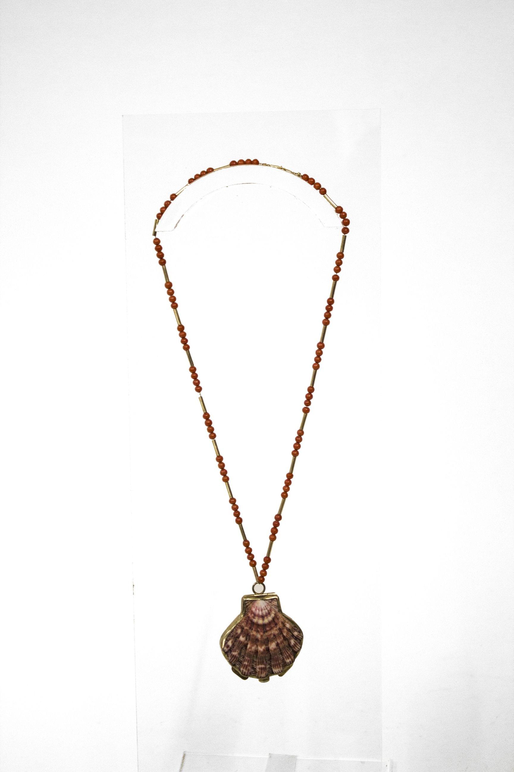3125. Collier de perles de corail retenant un pendentif coquillage ouvrant, poussoir serti d'une turquoise