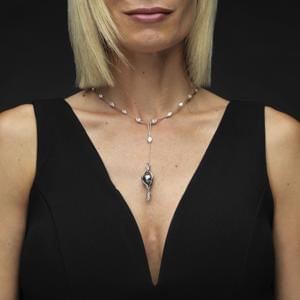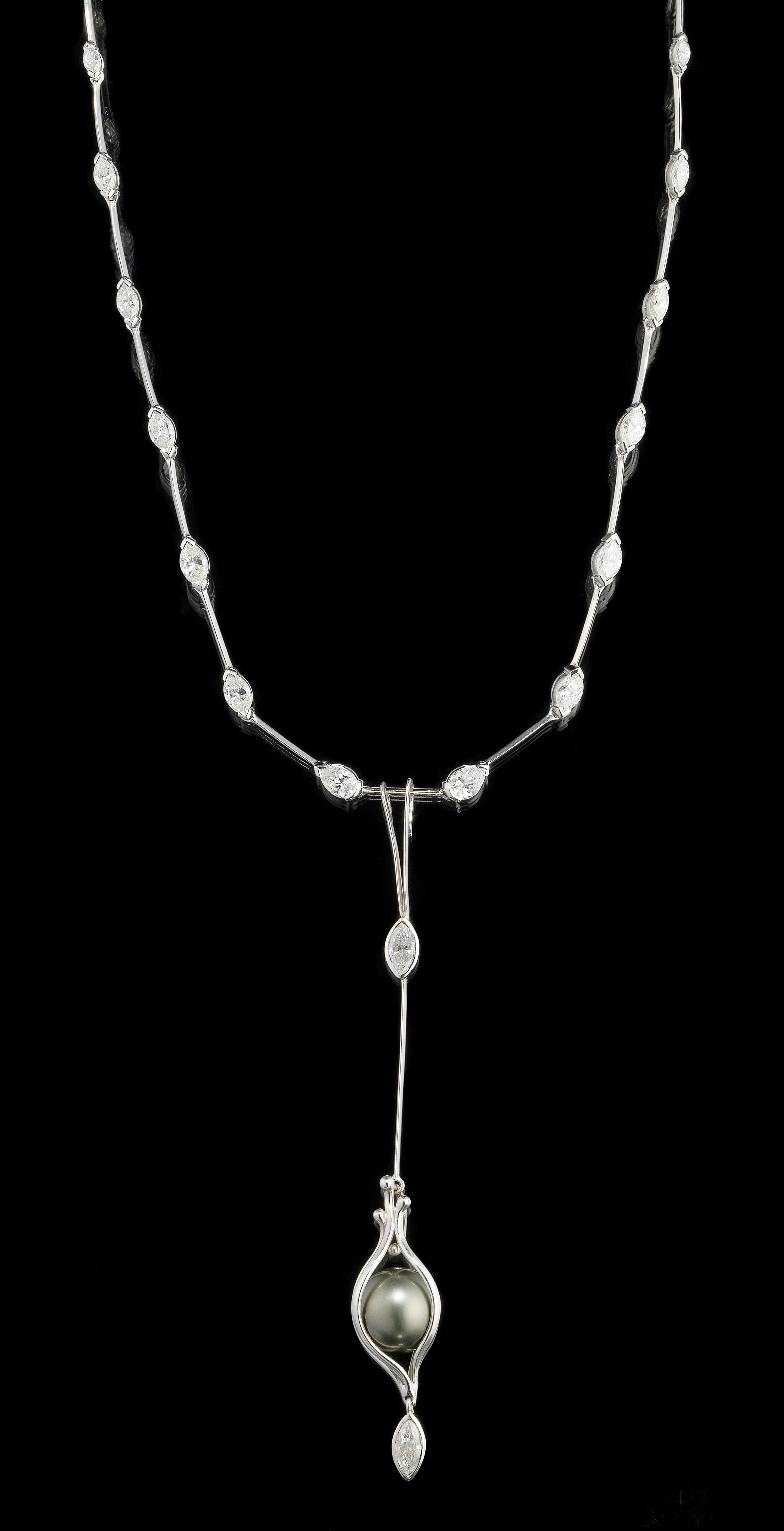 Ponctué de diamants taille marquise et taille poire (total env. 5 ct) retenant un pendentif amovible serti d'une perle grise (D env. 12,8 mm) et rehaussé de deux diamants taille marquise (total env. 1 ct)Or gris 750, signé Jud à Lausanne, L 40 et 45 cm, H pendentif 10 cm, 23 g