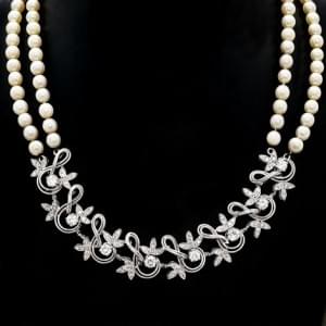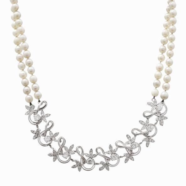 103. Collier deux rangs de perles orné d'un motif central serti de diamants (env. 4.7 ct)