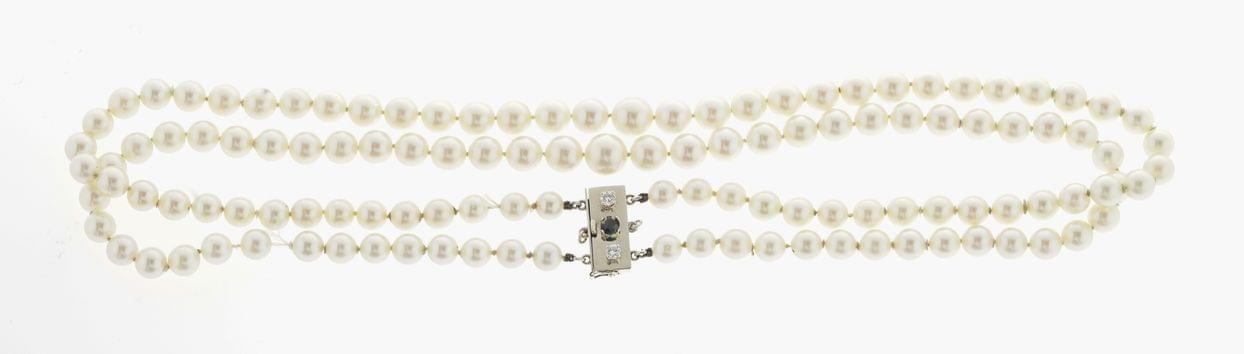 3123. Collier deux rangs de perles retenus par un fermoir serti de diamants et d'un saphir