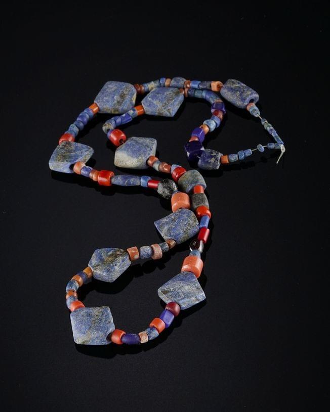 829. Collier en lapis lazuli, verre et cornaline, Proche ou Moyen-Orient, probablement IIIe-IIe millénaire av. JC
