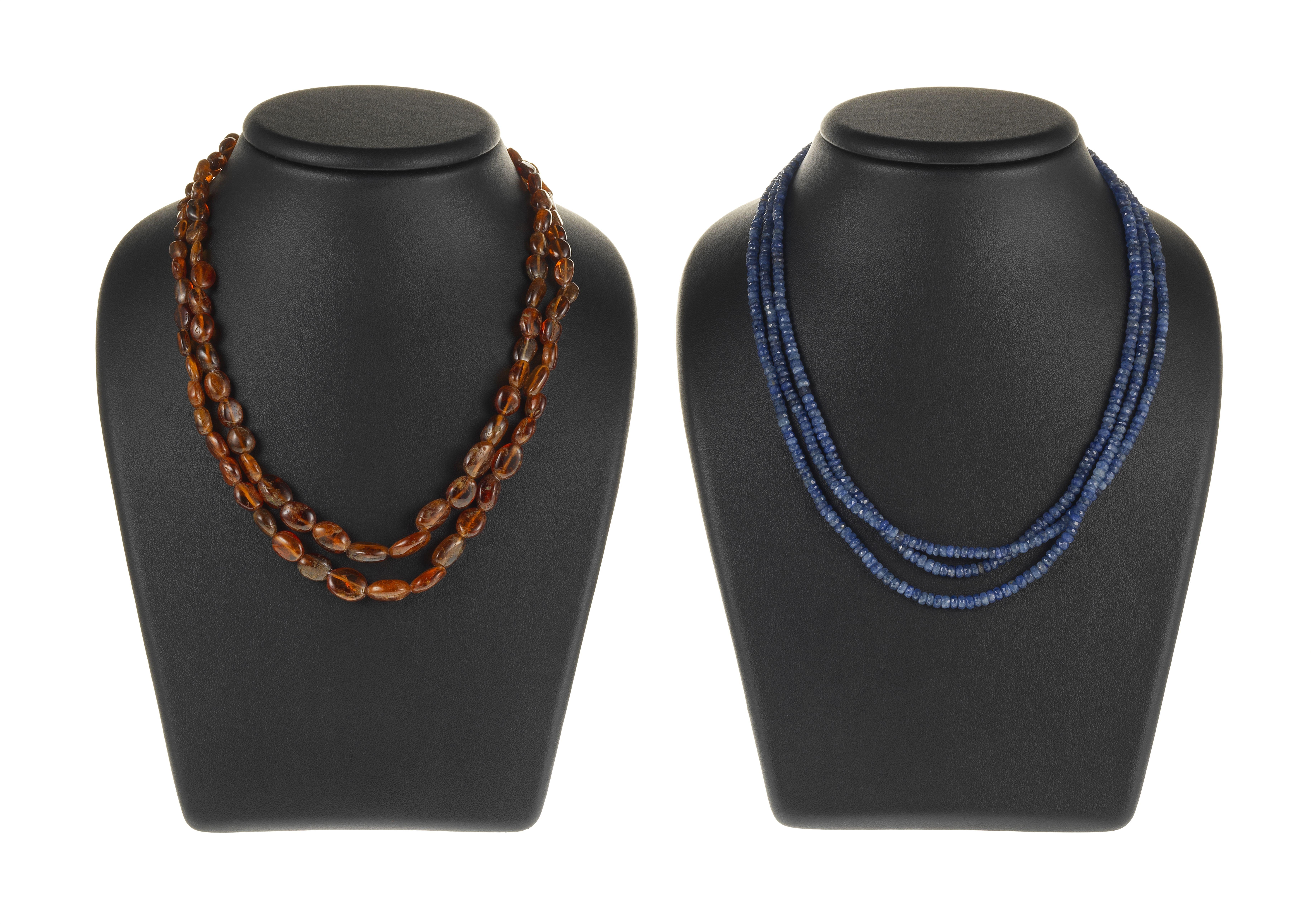 Fermoir en argent 925, L 45 cm. On joint un collier formé de deux rangs de grenats hessonites terminé par un fermoir serti d'un grenat et de roses de diamant, argent 925, L 44 cm. Pour les lots précédés d'un *, la TVA de 7,7% est due sur l'entier du prix d'adjudication.