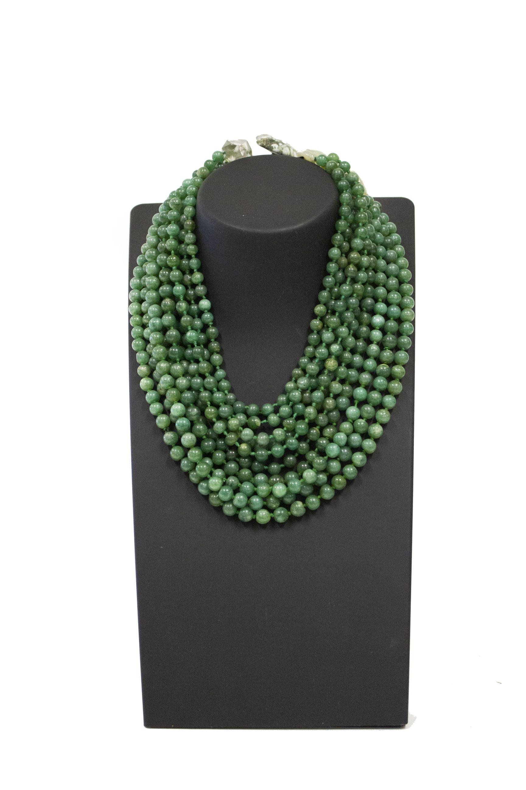 3204. Collier multi-rangs de perles d'aventurine terminé par un motif en jade et un fermoir en quartz