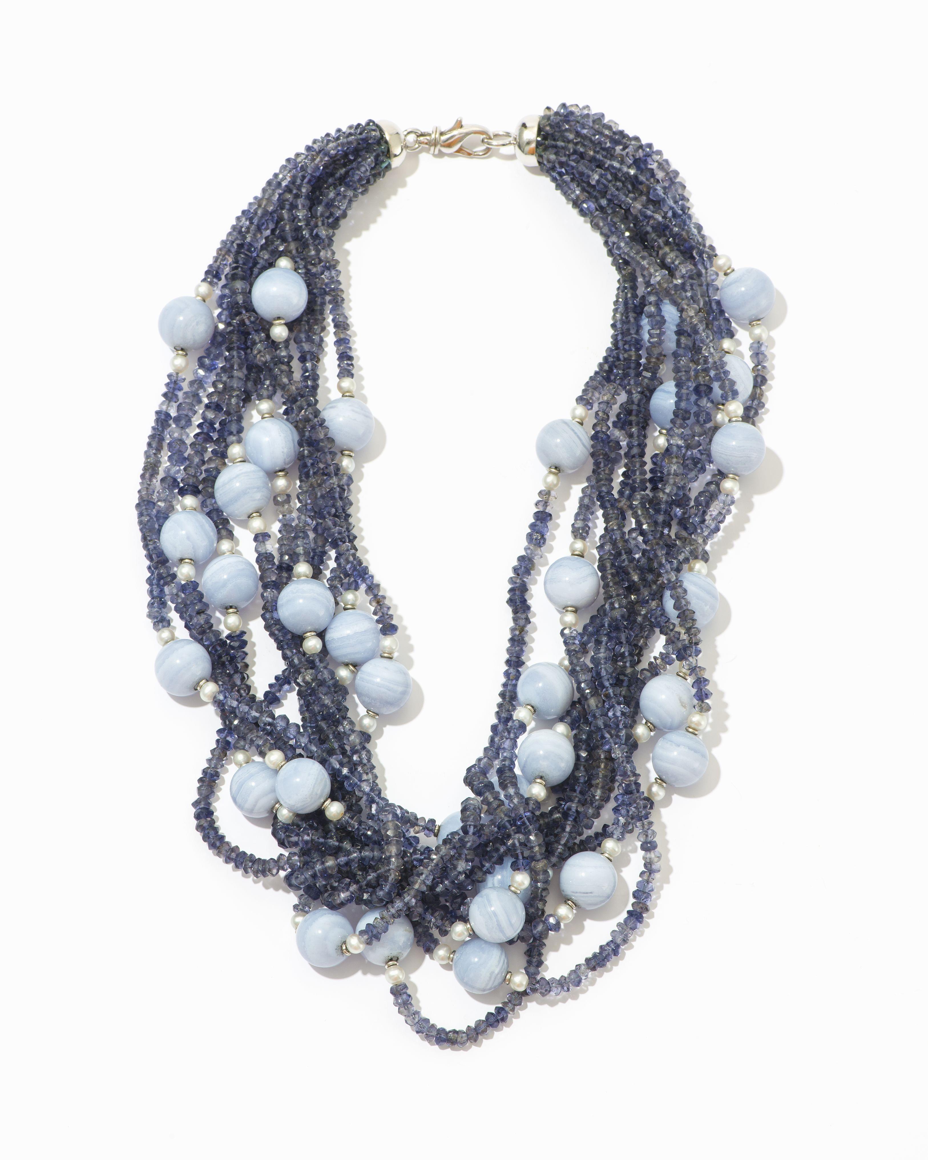 101. Collier multi-rangs d'iolites alternées de boules de calcédoines bleues et de perles