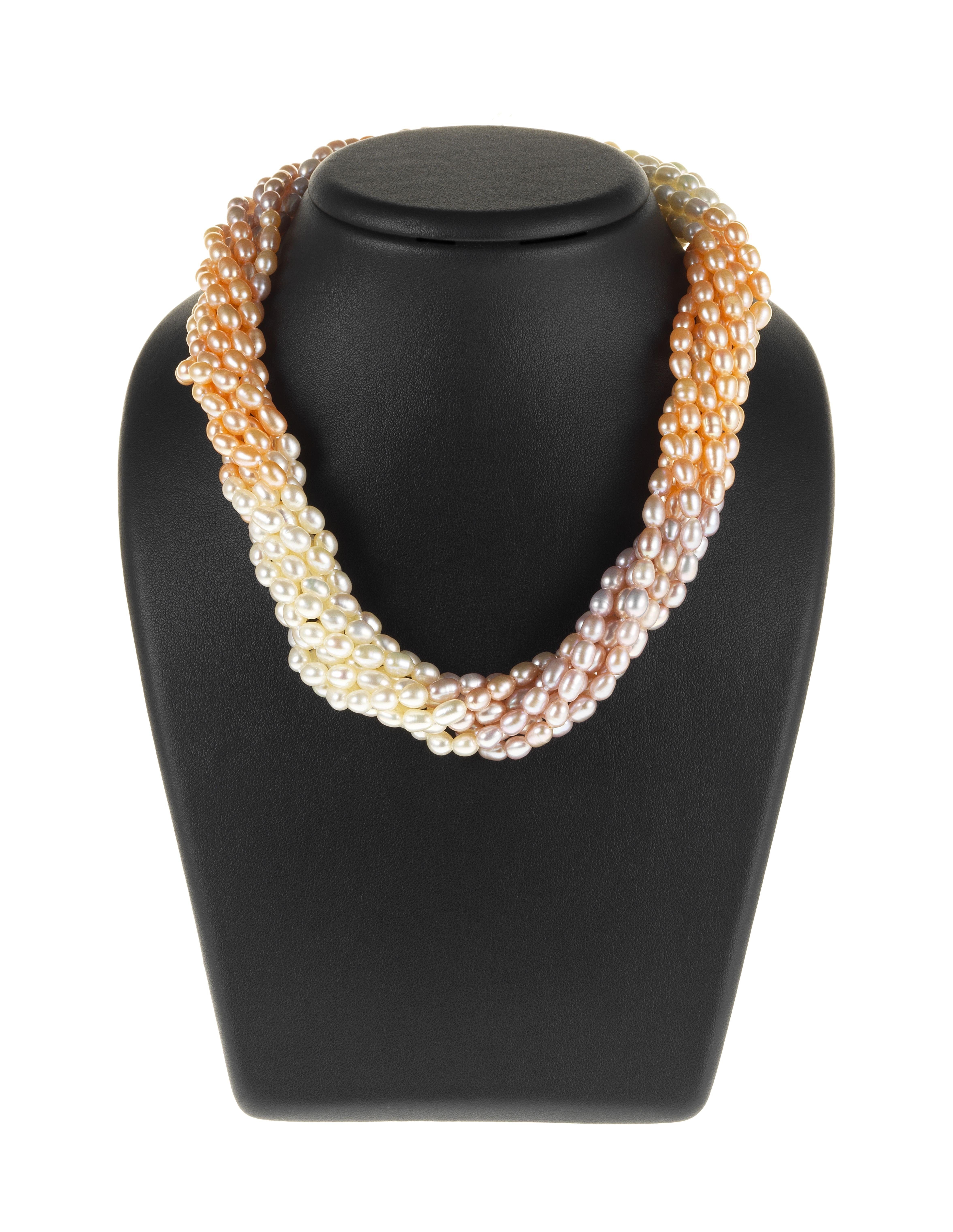 3116. *Collier multi-rangs torse de perles blanches, rosées et orangées