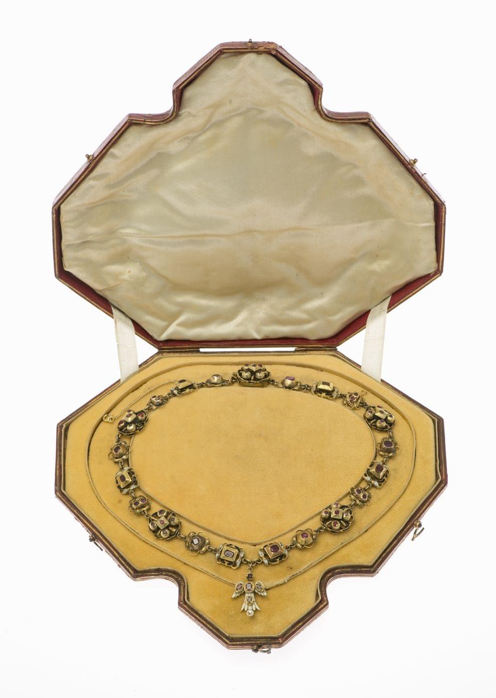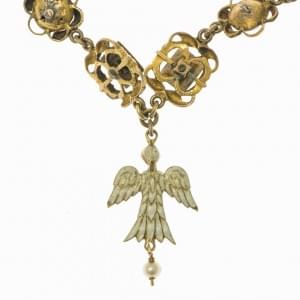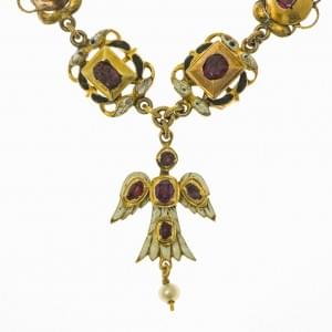 235. Collier orné de rubis en sertis clos et d'émaux, retenant une colombe émaillée sertie de rubis