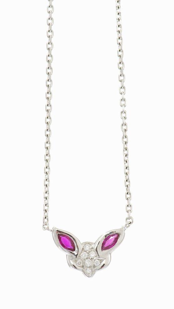 303. Collier retenant un pendentif à motif de tête de fennec serti de diamants et rubis