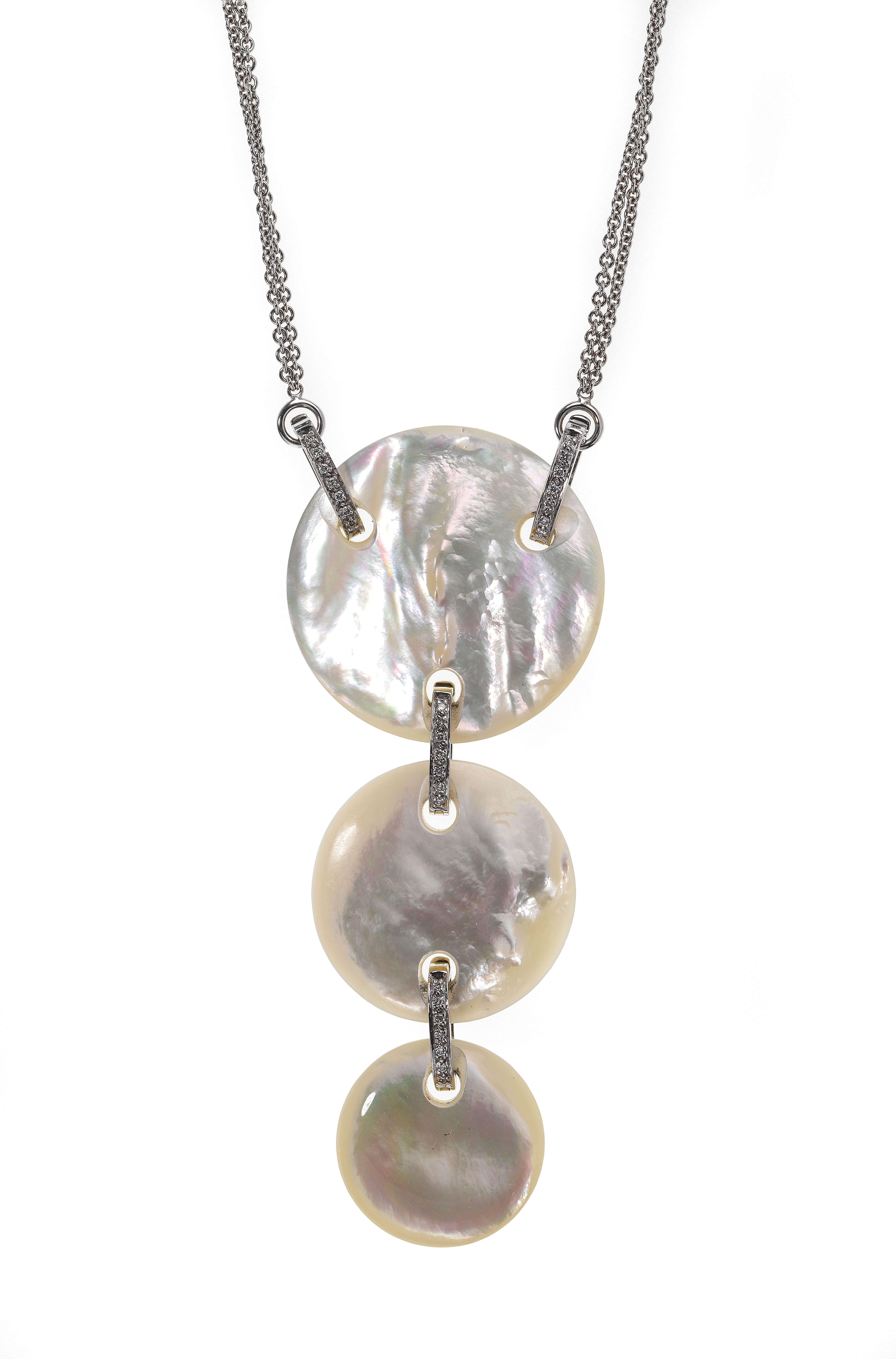 3307. Collier retenant un pendentif formé de trois disques de nacre rehaussés de lignes de diamants