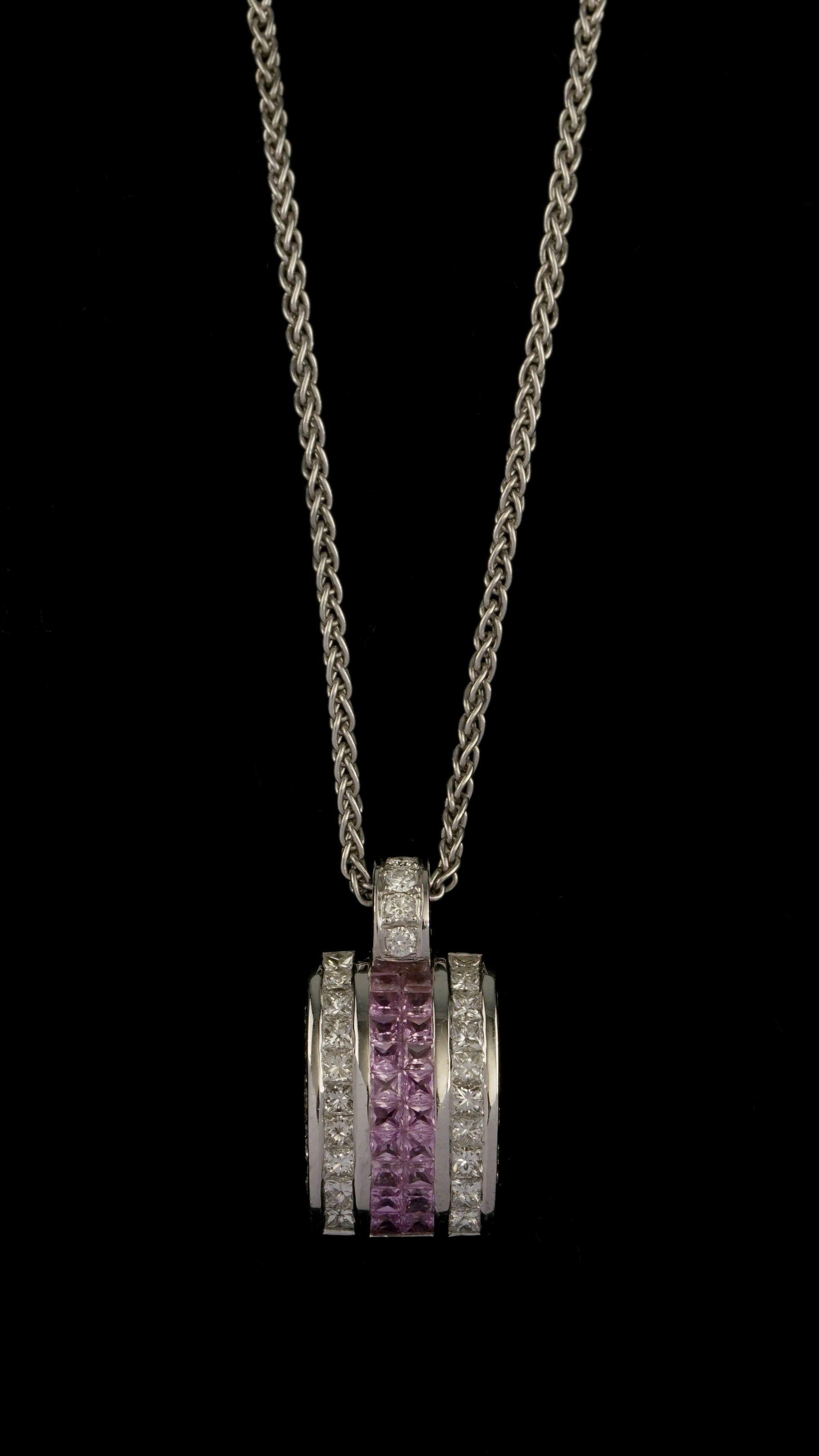 768. Collier retenant un pendentif serti de saphirs roses taille princesse encadrés de diamants taille princesse