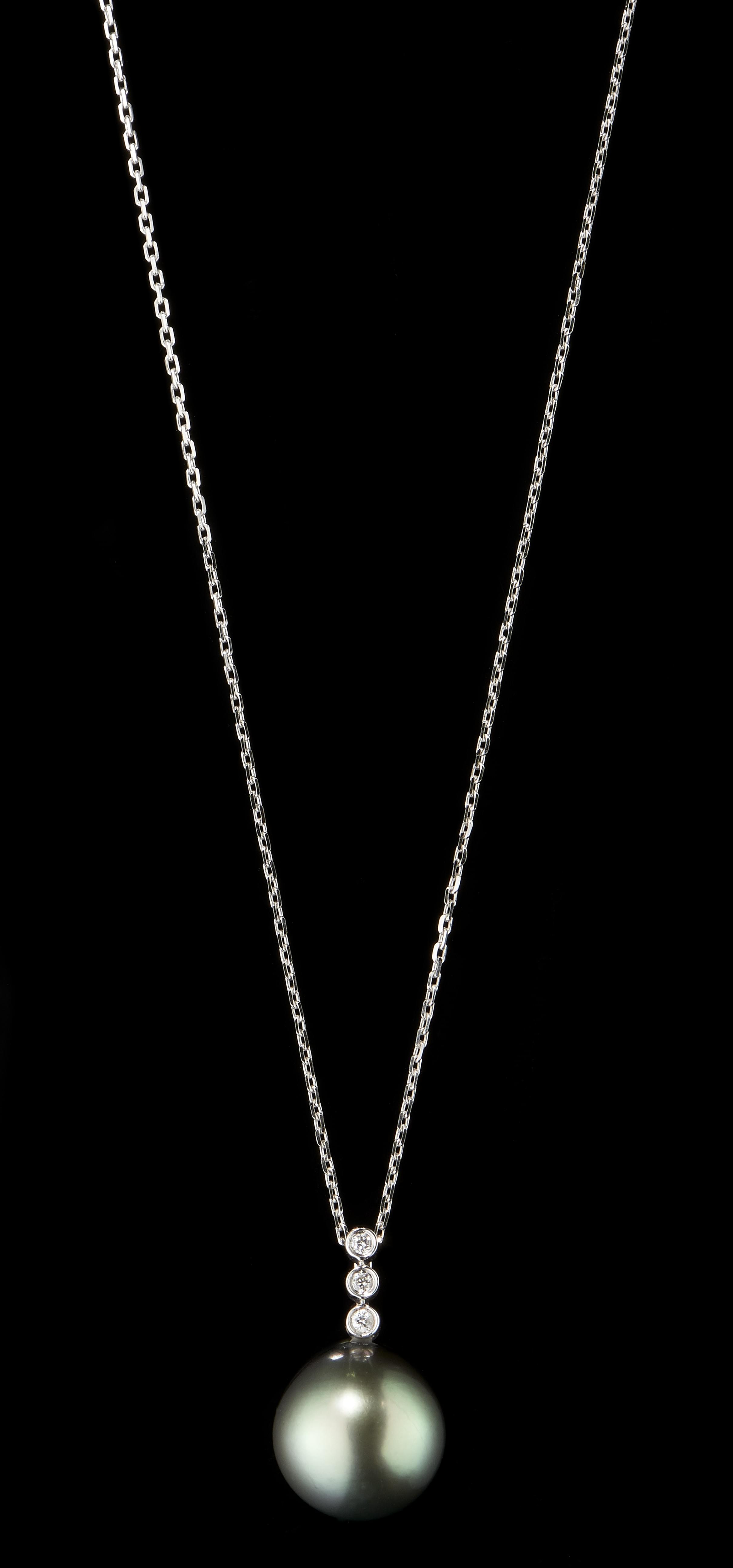 1007. Collier retenant une perle de Tahiti (D env. 12 mm) rehaussée de diamants