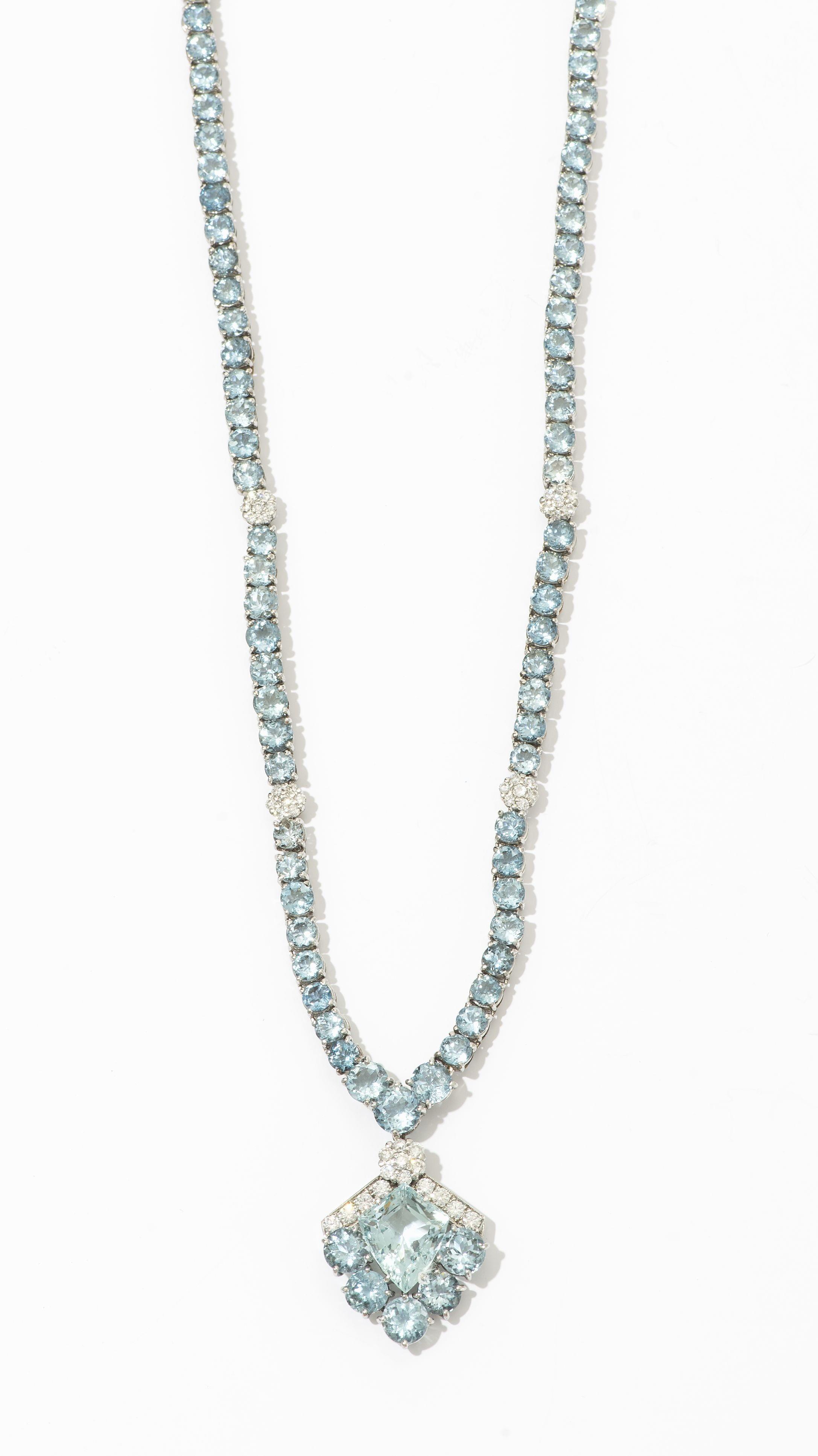 126. Collier serti d'aigues-marines taille brillant et de diamants taille brillant et retenant un pendentif central taille en forme cerf volant