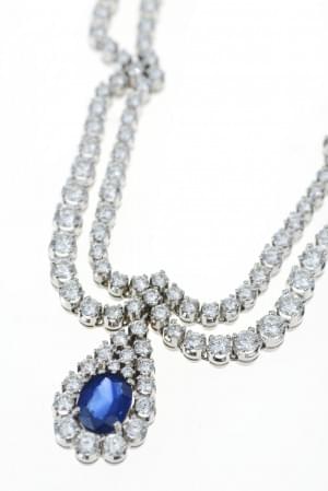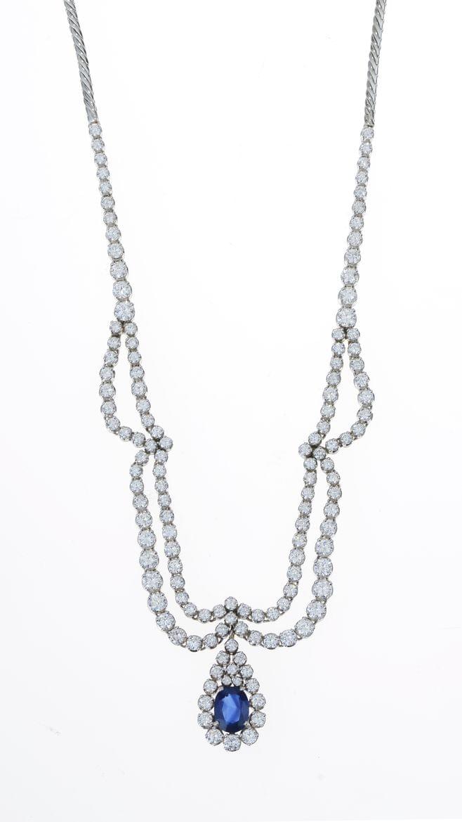 63. Collier stylisé à décor de guirlandes serties de diamants taille brillant retenant un saphir taille ovale