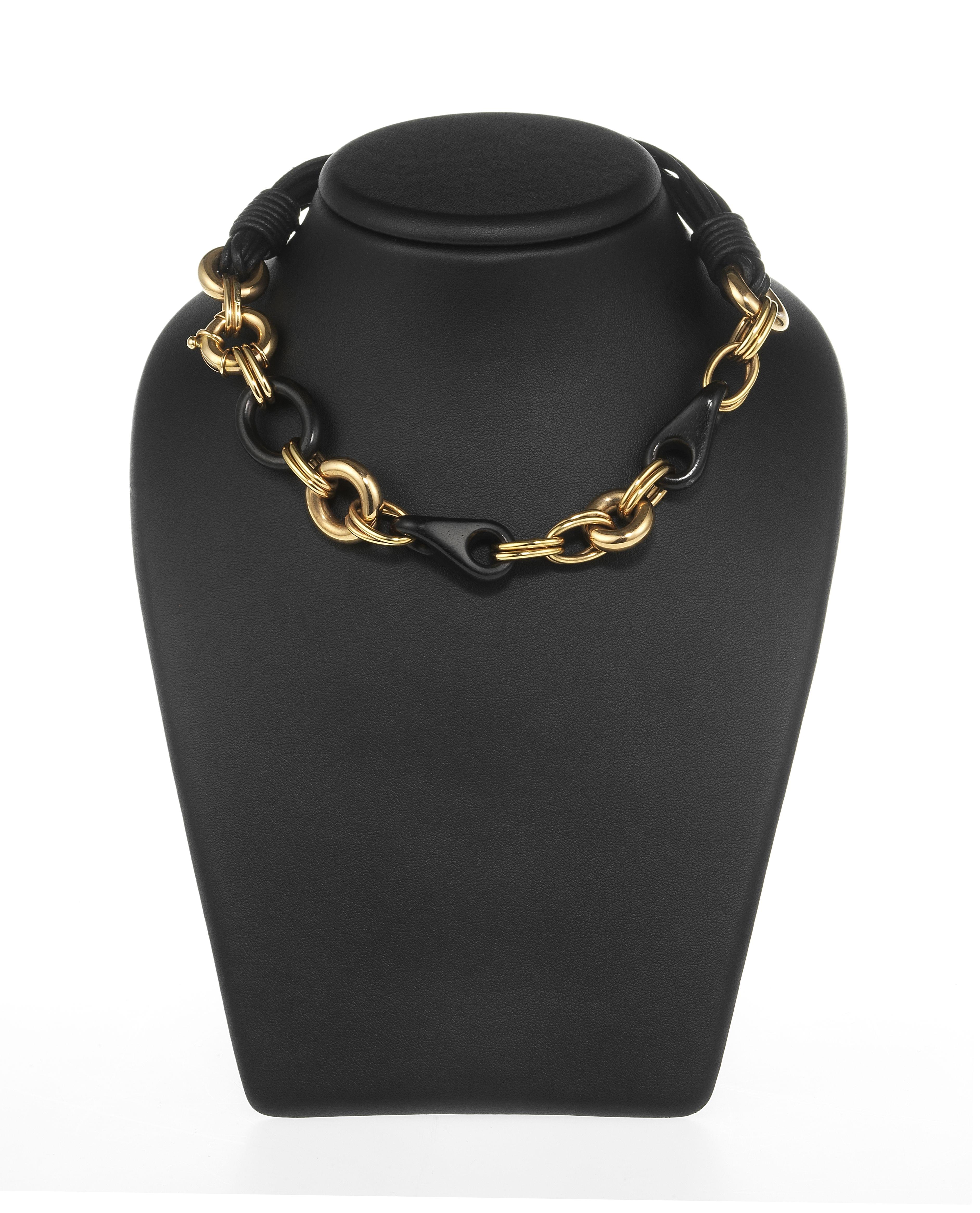 3351. Collier stylisé sur cordon noir, alterné de motifs à maille ovale et ronde en or et bois exotique