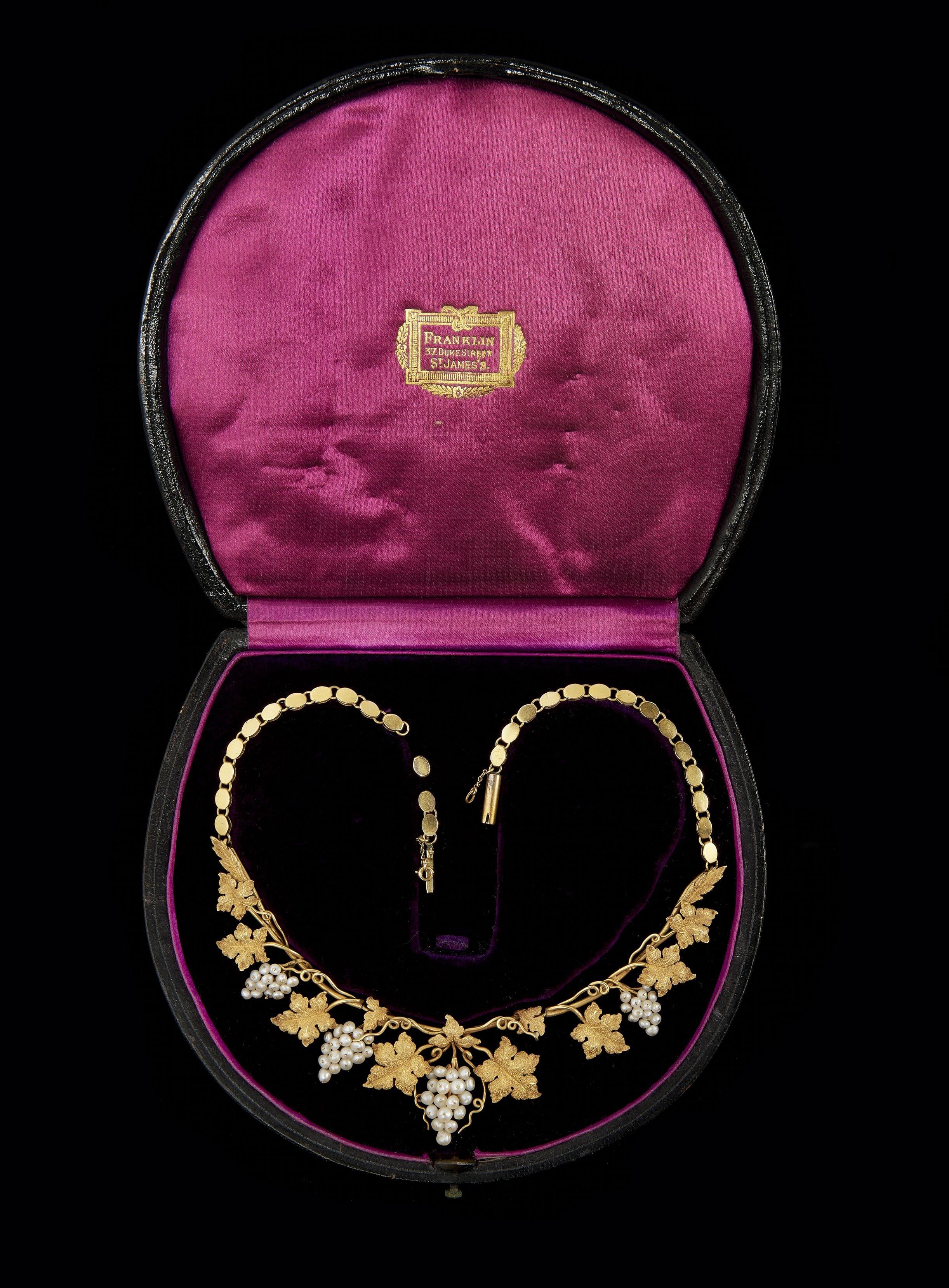 96. Collier tour de cou à décor de pampres de vigne serti de perles, dans un écrin Franklin, 37 Duke street Saint James