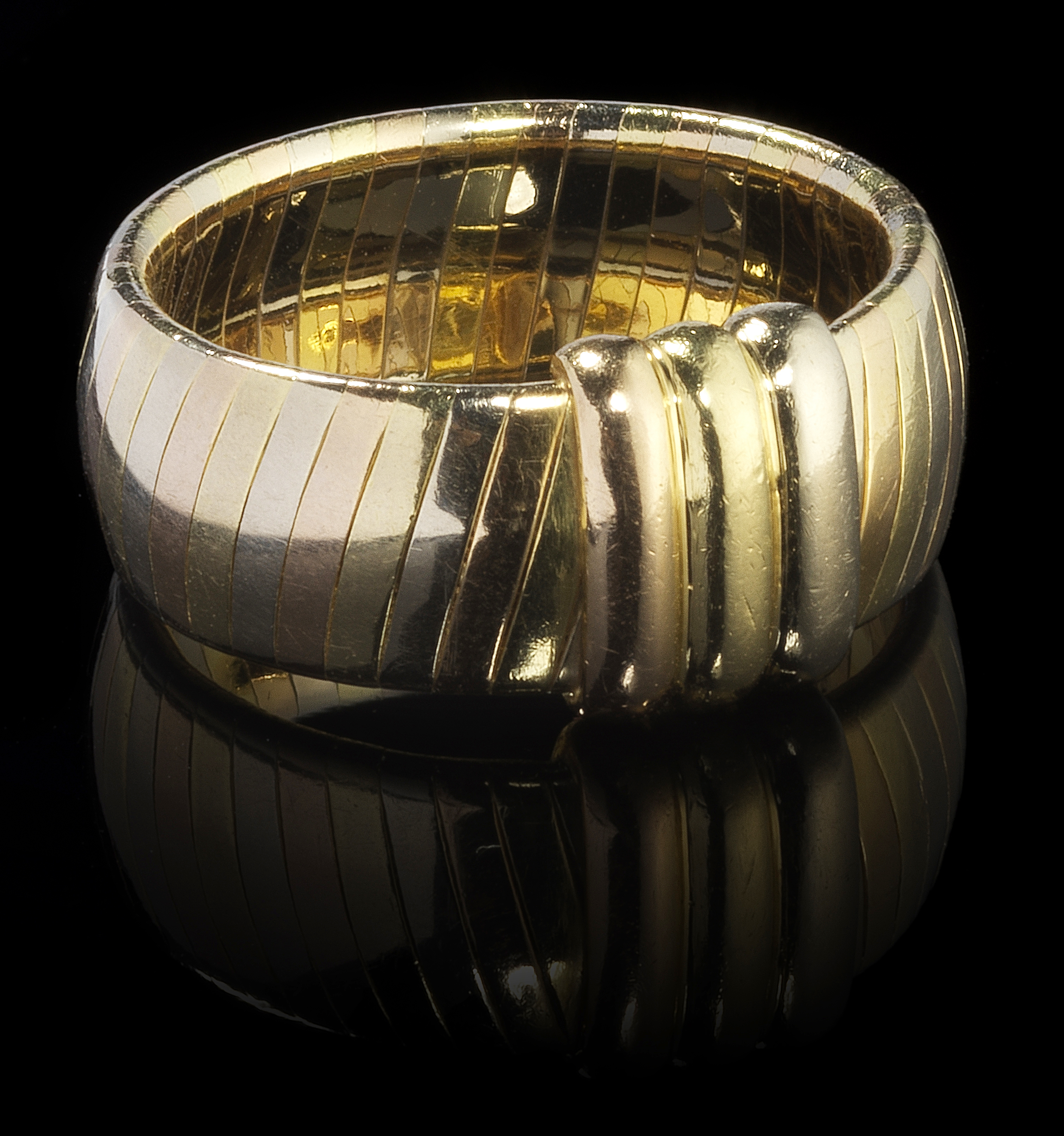 53. Cartier, bague bandeau trois ors centrée d'un motif de trois god...