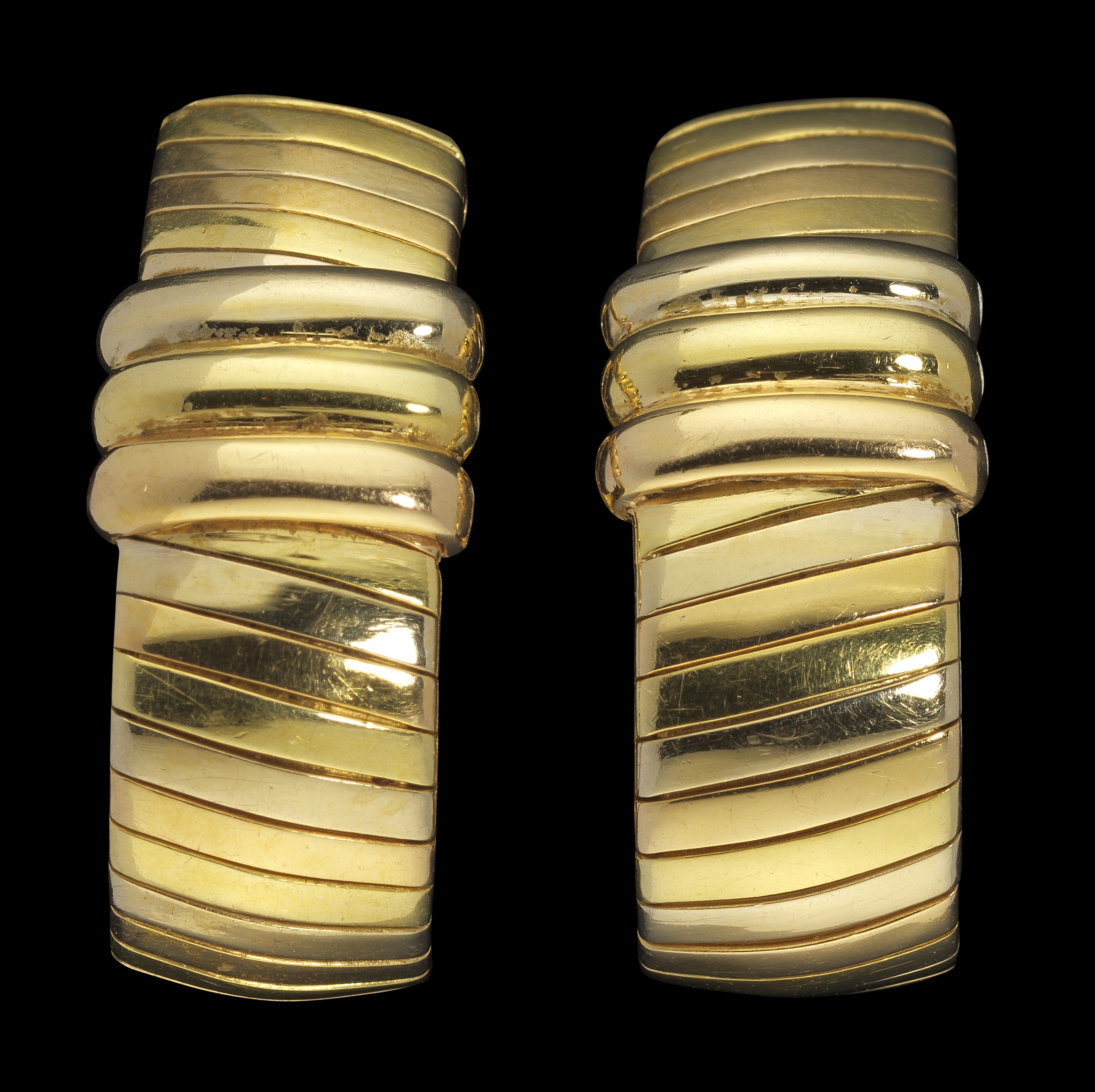 55. Cartier, boucles d'oreilles trois ors centrées d'un motif de tro...