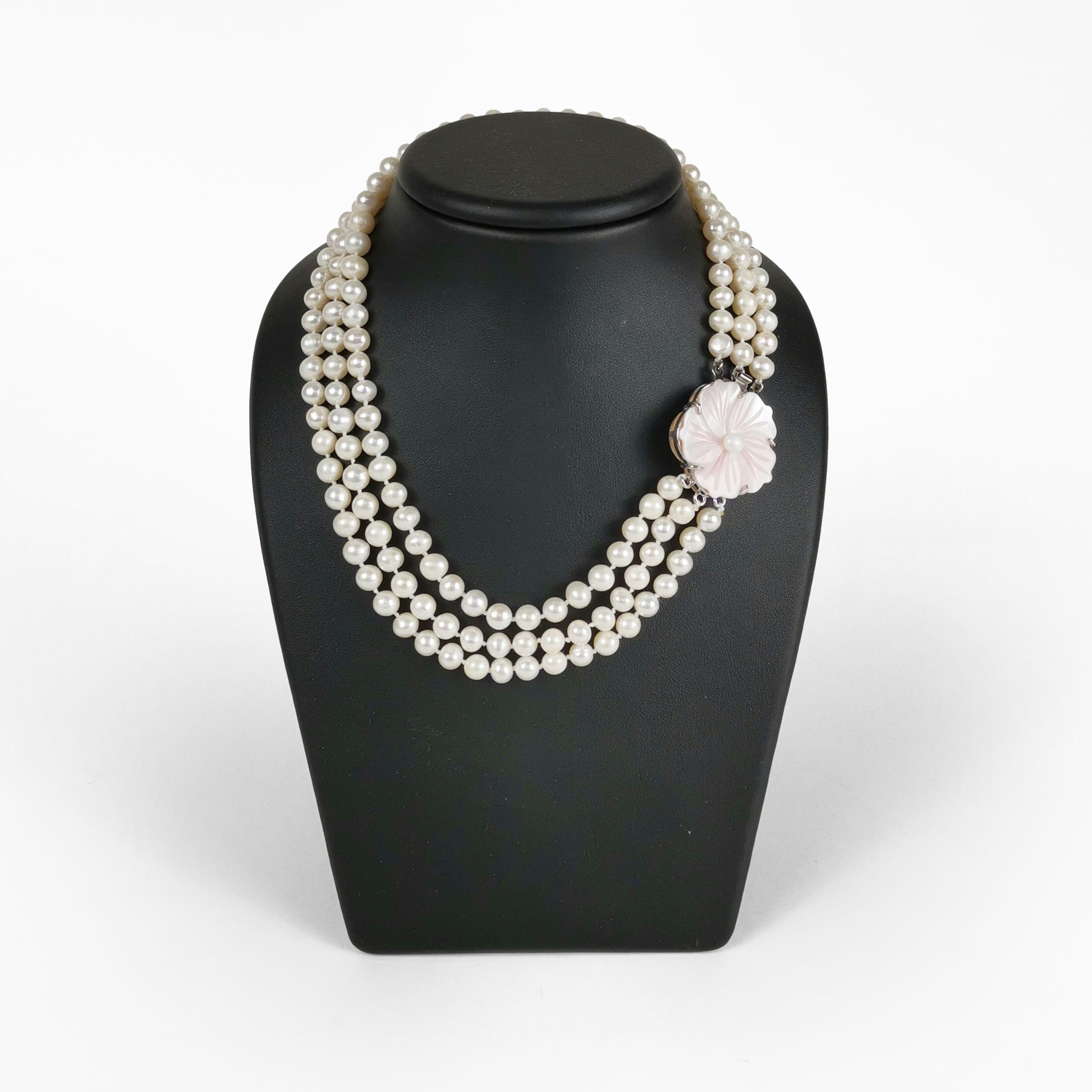 3037. Collier trois rangs de perles d'eau douce terminé par un fermoir serti d'une fleur en nacre rose