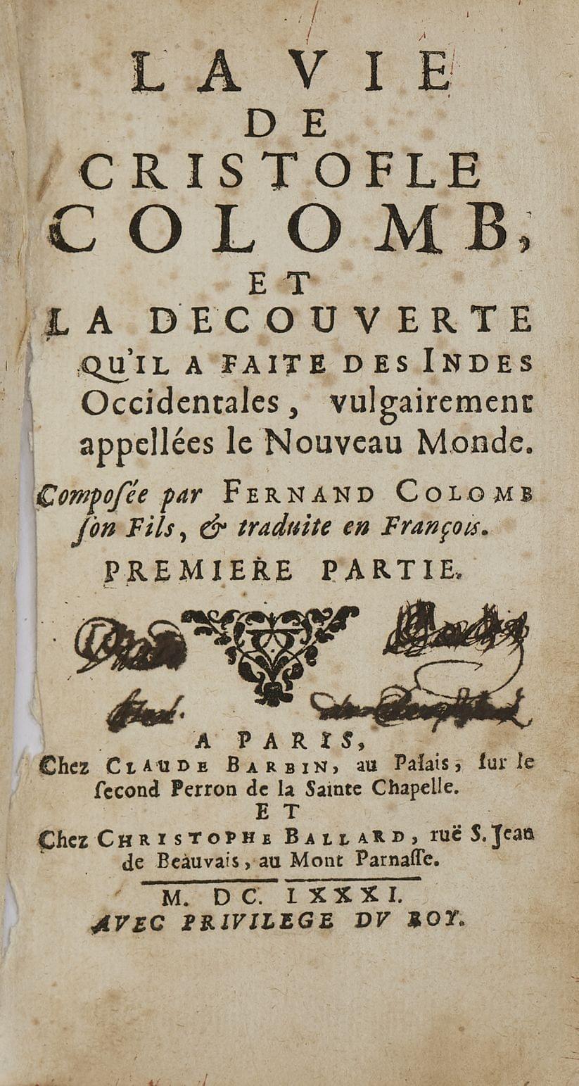 3718. COLOMB (Fernand) : La Vie de Christophe Colomb et la Découverte qu’il a faite des Indes Occidentales, vulgairement appellé le Nouveau Monde. Paris, 1681; deux vol. in 12, veau brun, dos à nerfs ornés. Reliure de l’époque. Intéressante biographie écrite par le fils du navigateur ; la première édition fut publiée à Venise en 1571. (usures et rousseurs).