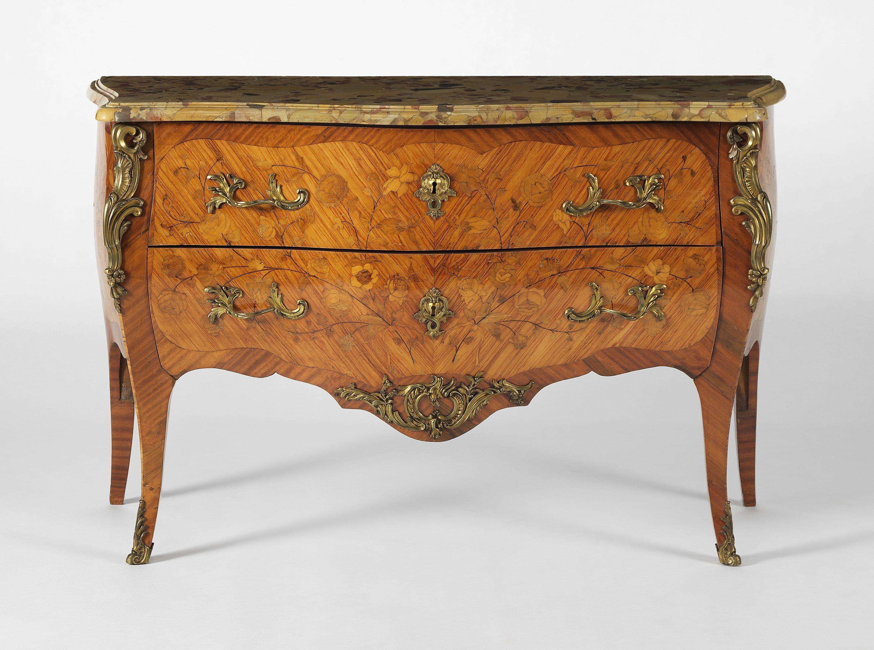 Deux tiroirs sans traverse, marqueterie de bois précieux à motifs floraux, bronze doré et marbre brèche d'Alep, 88x140x52 cm