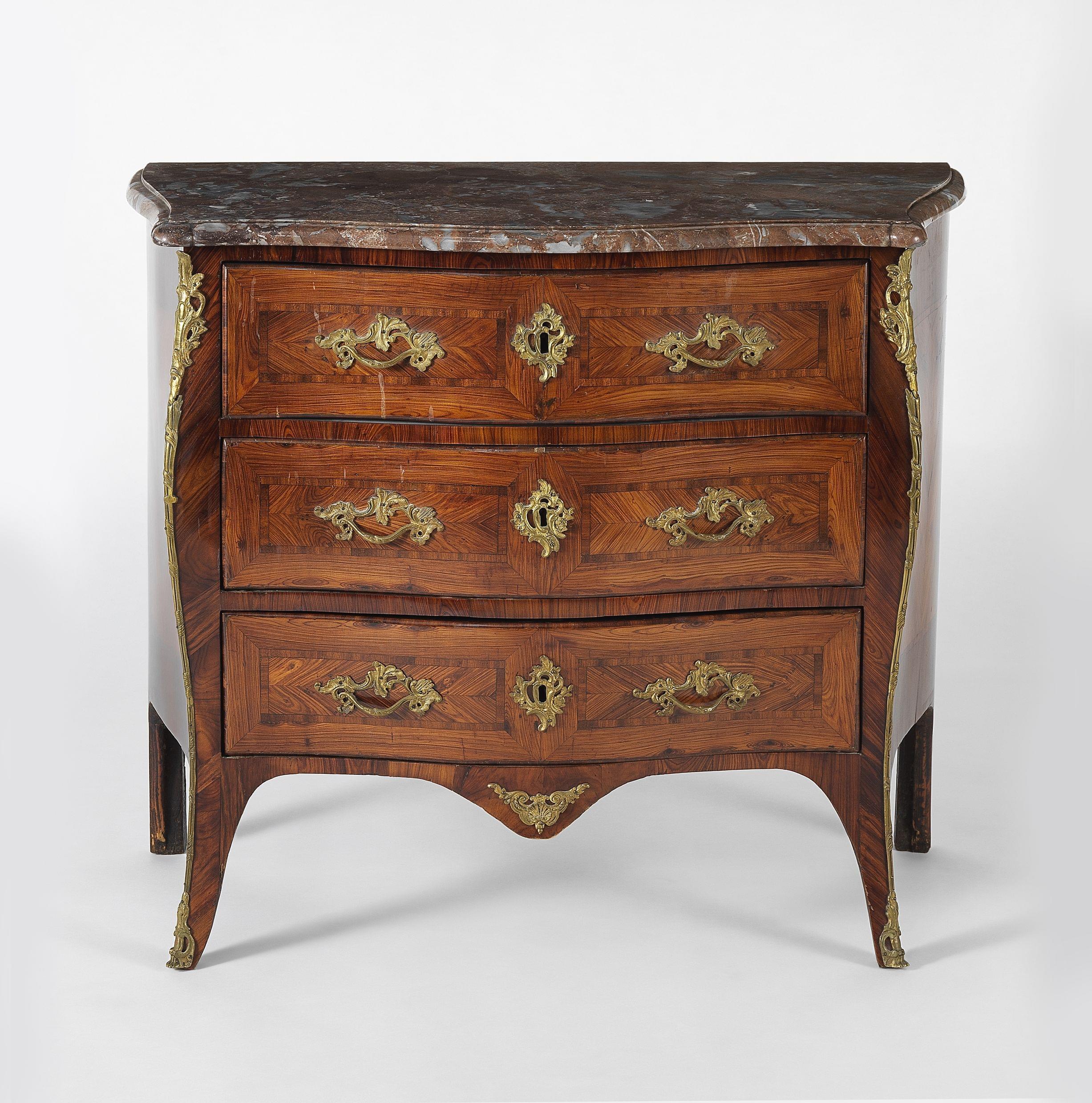 Trois tiroirs, bois de rose et bois de violette, marbre, bronze doré, 83x94x45 cm
