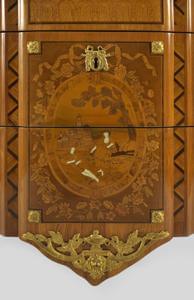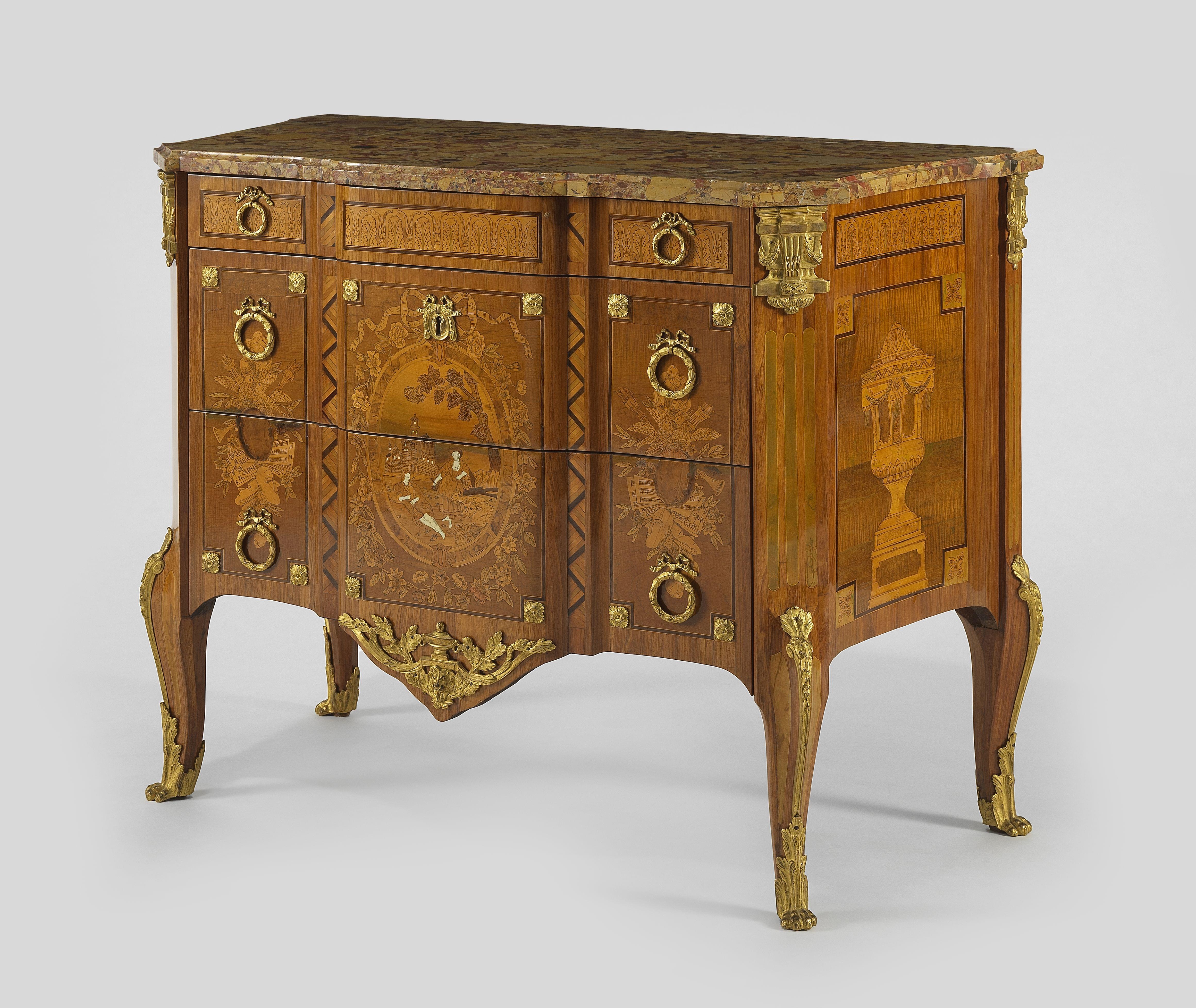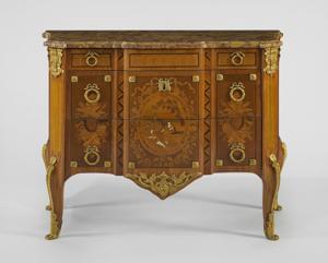 Bois fruitier richement marqueté à décor de trophées musicaux et d'une scène galante dans un médaillon, bronzes dorés, marbre brèche d'Alep, estampillée JME, 87,5x110x56 cm. Christopher Wolff, maître en 1755. Provenance: Jacques Perrin, Paris, 1989; couple d'amateurs en Suisse
