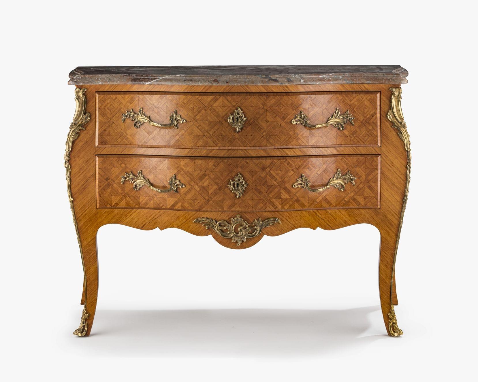 Bois de rose marqueté en croisillons, bronze doré, marbre, 83x114x53 cm