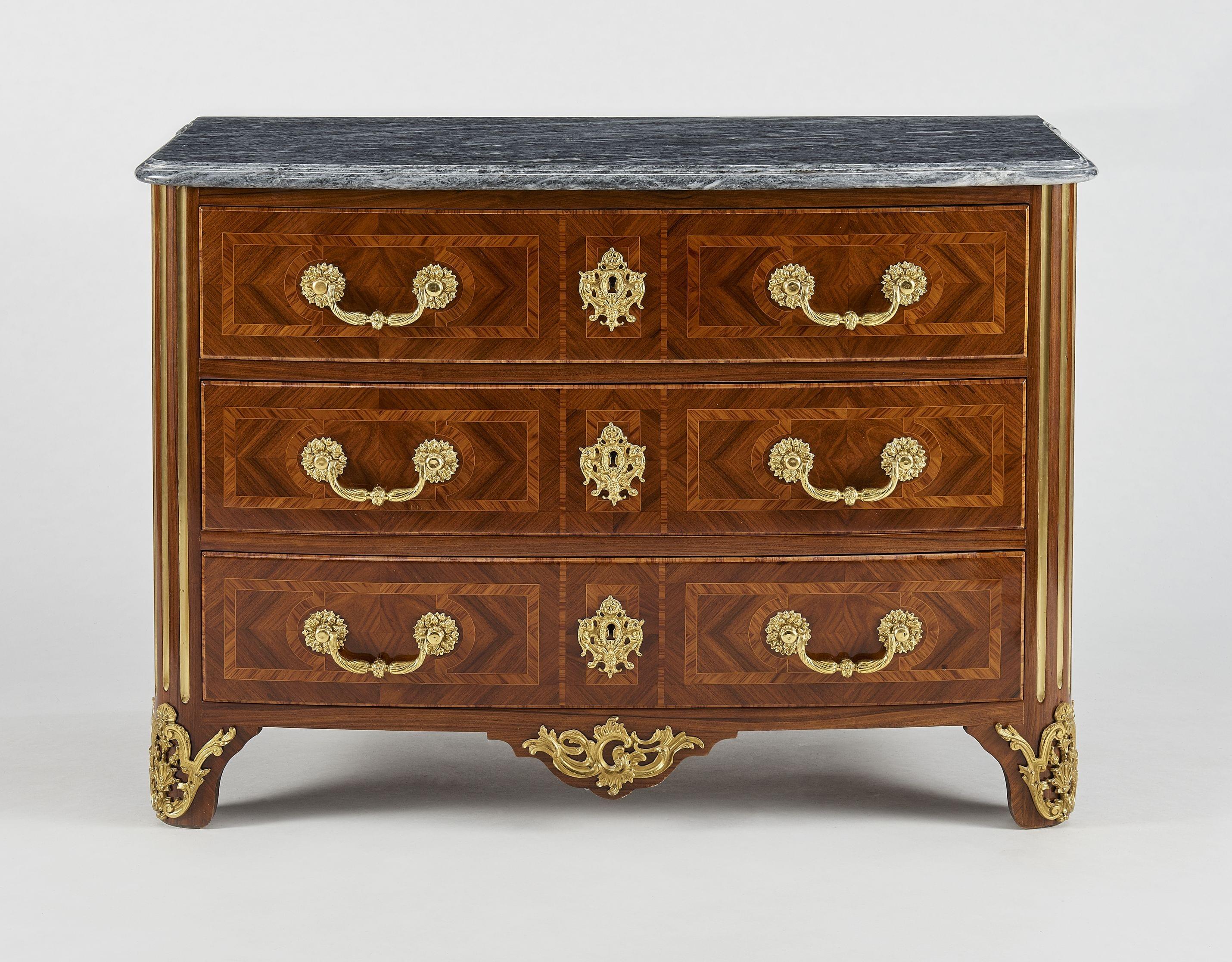 Trois tiroirs, placage de bois précieux, bronze doré et marbre, 84x115x60 cm. Provenance: collection Pernet-Villaverde